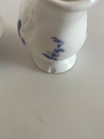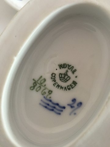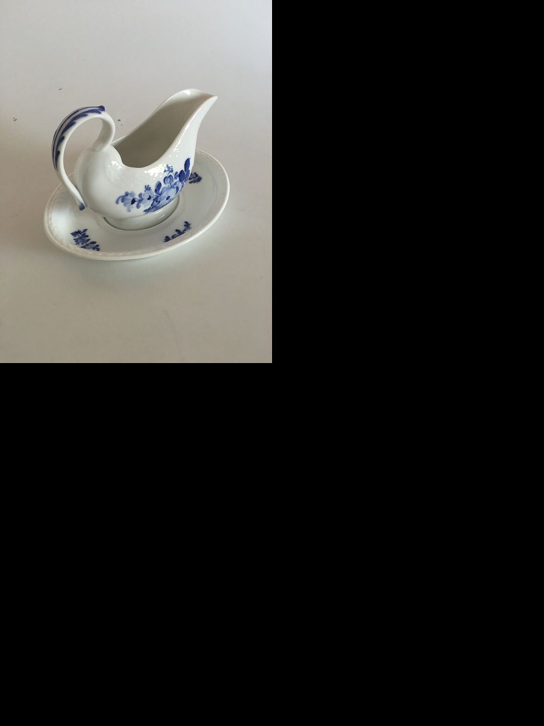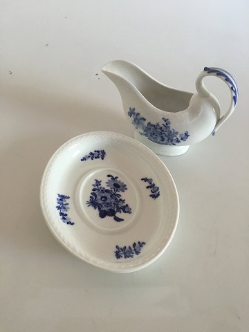 Royal Copenhagen Blå Blomst Flettet Saucekande med Løst Underfad No 8069. Måler 14.5 x 19 cm (5 45/64 x 7 31/64 in). Underfad 23 cm (9 1/16 in). Bemærk at Saucekanden har et lille skår på sin fod.