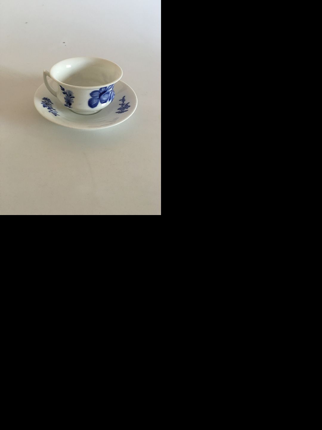 Royal Copenhagen Blå Blomst Tekop og Underkop. Kop måler 9.2 x 5.5 cm. Vi har 4 kopper men kun to underskåle.