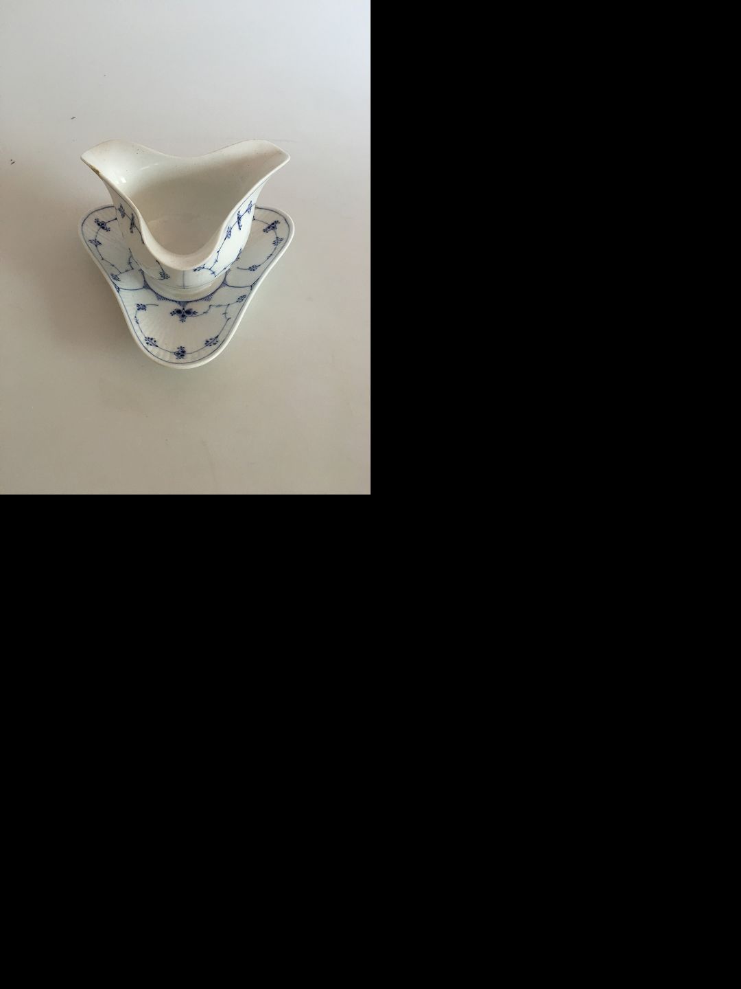 Royal Copenhagen Blue Fluted Plain Triangular Saucebowl No 203. 21.5 cm. 11 cm tall. The bowl has a couple of chips, look at pictures for details.