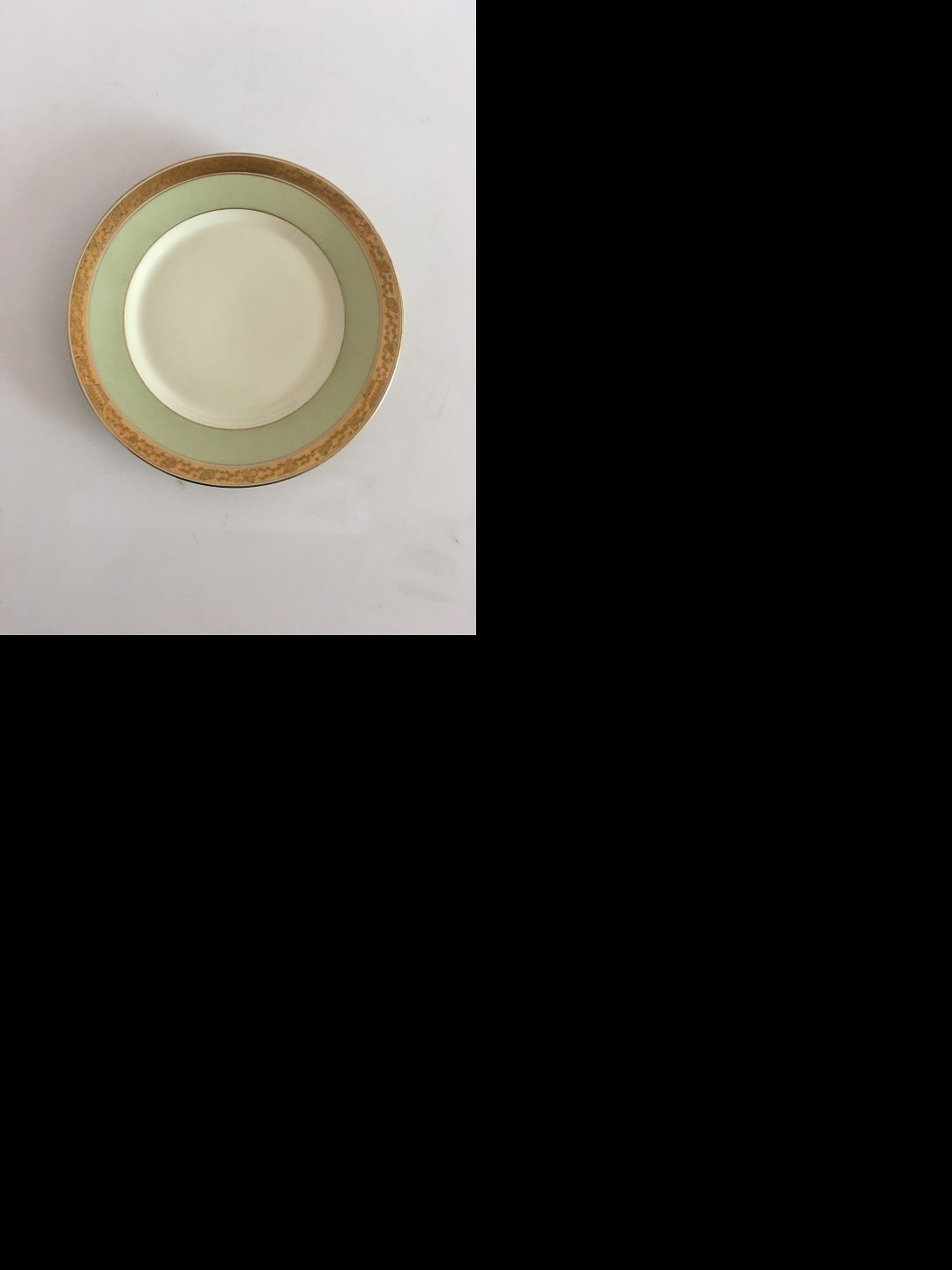 Royal Copenhagen Dagmar Desserttallerken No. 9628. Måler 19 cm / 7.48 in. Pistaciegrøn og cremefarvet stel med guldkant designet af Thorkild Olsen i 1930'erne