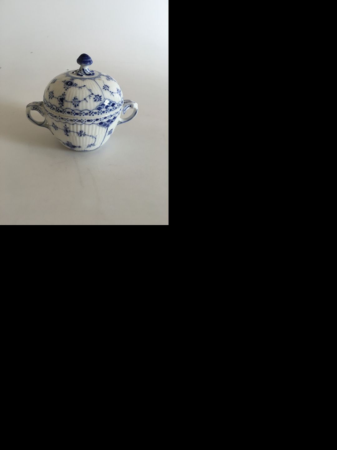 Royal Copenhagen Blue Fluted Half Lace Sugar Bowl No. 605. Measures 7 cm / 2 3/4 in. x 10 cm / 3 15/16 in. without lid.