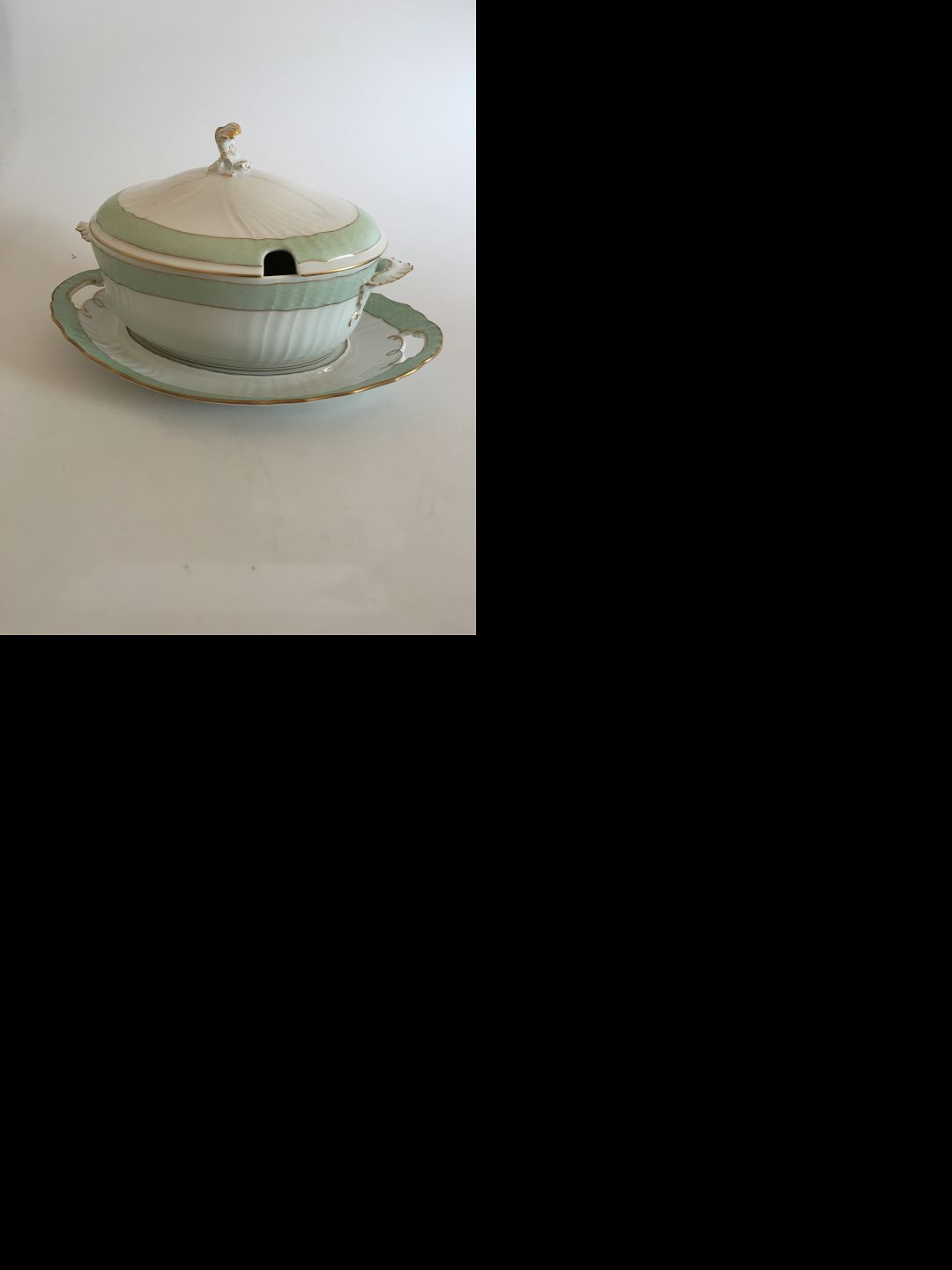Royal Copenhagen Green Curved with Gold Tureen No 1666 and Platter No 1671. 26 x 9.5 cm (10 15/64" x 3 47/64")