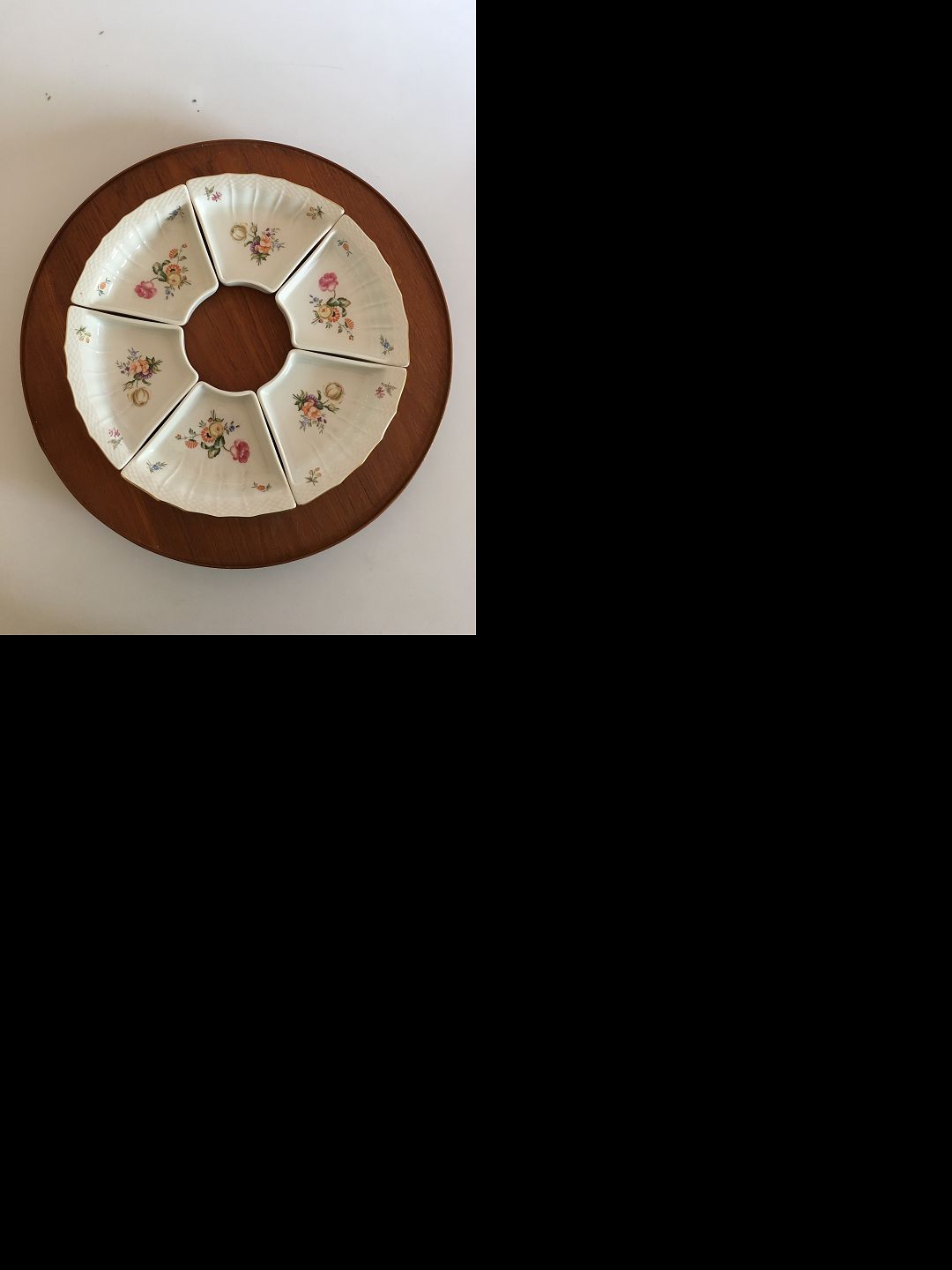 Royal Copenhagen Trelleborg Kabaret Skåle 6 stk No 1884. med roterende teaktræsbakke. Skålene er i fin stand.
