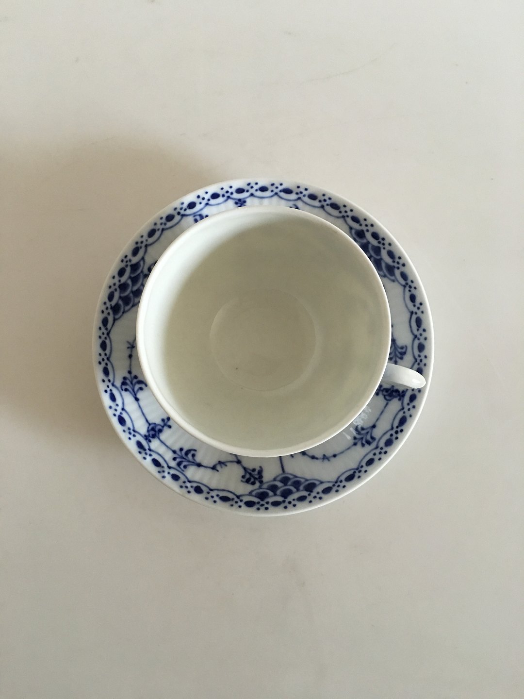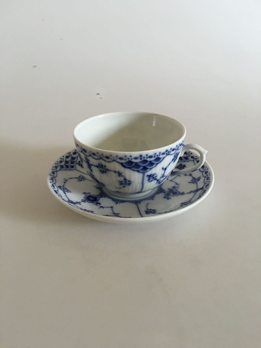 Royal Copenhagen Blue Fluted Half Lace Cup and Saucer No 713. Cup measures 8.5 cm dia / 3 11/32 in. and 5 cm H / 1 31/32 in. In good condition.