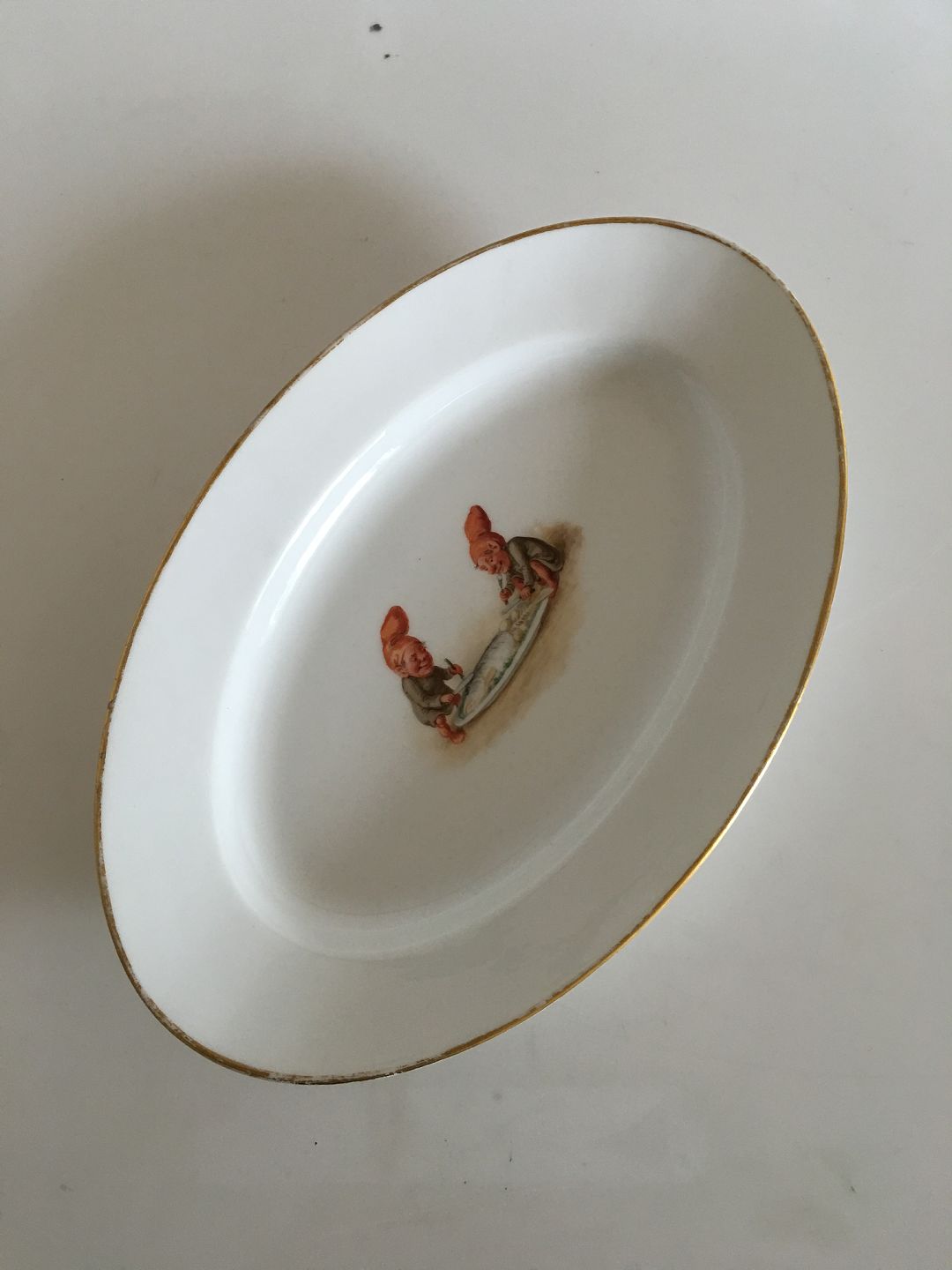 Oval Serving Dish with Two Gnomes Eating a Fish. 34 x 22 cm (13 25/64" x 8 21/32"). The gold is partly worn, but otherwise the dish is in good condition without any chips or cracks.