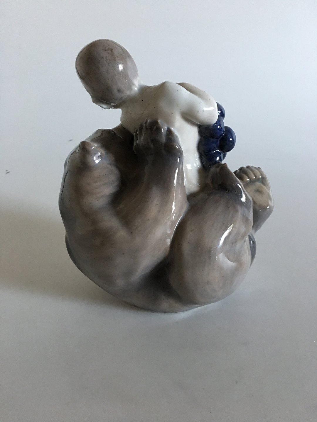 Royal Copenhagen Figurine of Faun with Grapes Sitting on a Bear No 2318. Reparation around the neck of the Faun. 17 cm tall (6 11/16"). 15 cm wide (5 29/32")