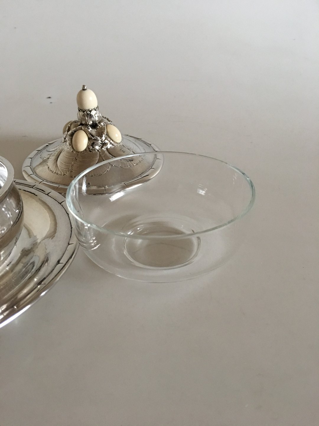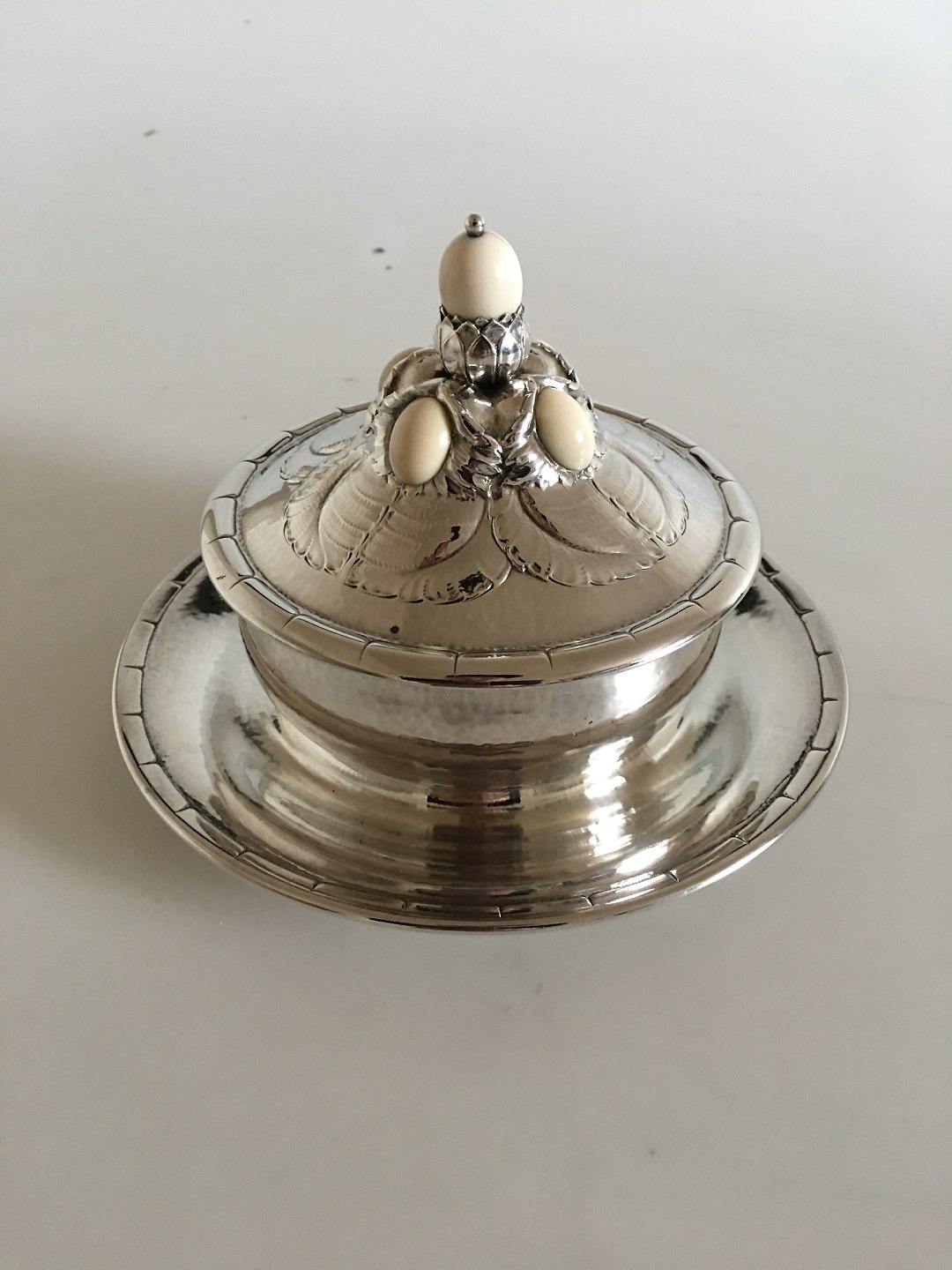 Georg Jensen Sterling Sølv Kaviar Skål No 44. Med stempler fra 1932-1944. Smukt ornamenteret låg prydet med mandelformede kugler af elfenben. Med glasindsats som har et enkelt lille flig i kanten. Ellers er hele kaviarskålen i meget fin stand. 12 cm H (med låg). Skåldelen har en diameter på 11 cm. Underskålen en diameter på 17 cm. Vejer uden glasindsatsen 511 gram.