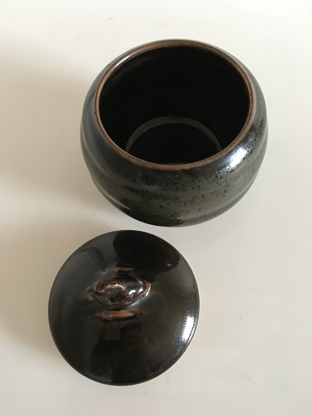Royal Copenhagen Knud Kyhn Stoneware Pot with Lid No 20509. Beautiful glaze. The pot has a small chip / crack in the side, otherwise in nice condition. 15 cm H (5 29/32"), 14 cm dia (5 33/64")