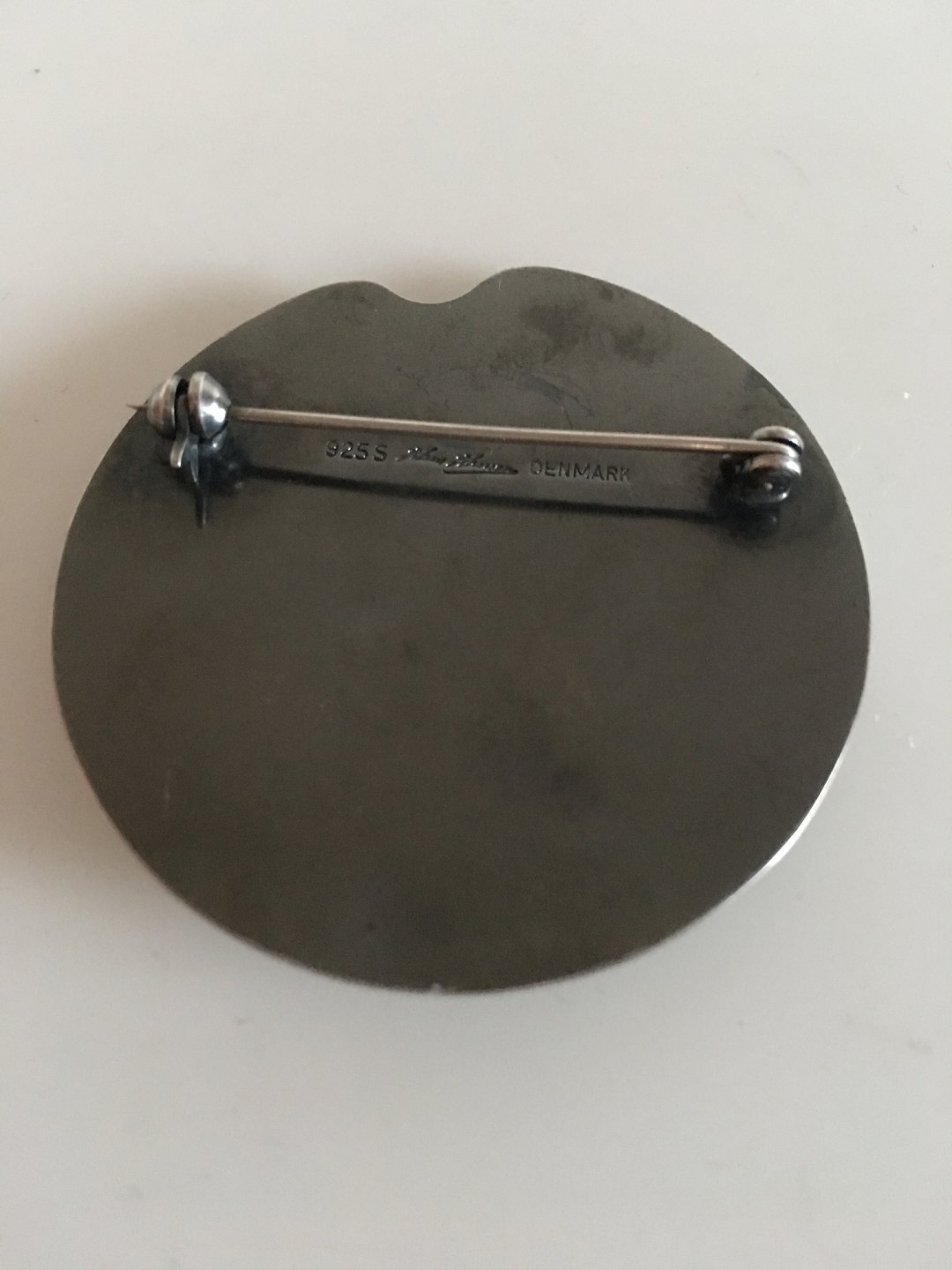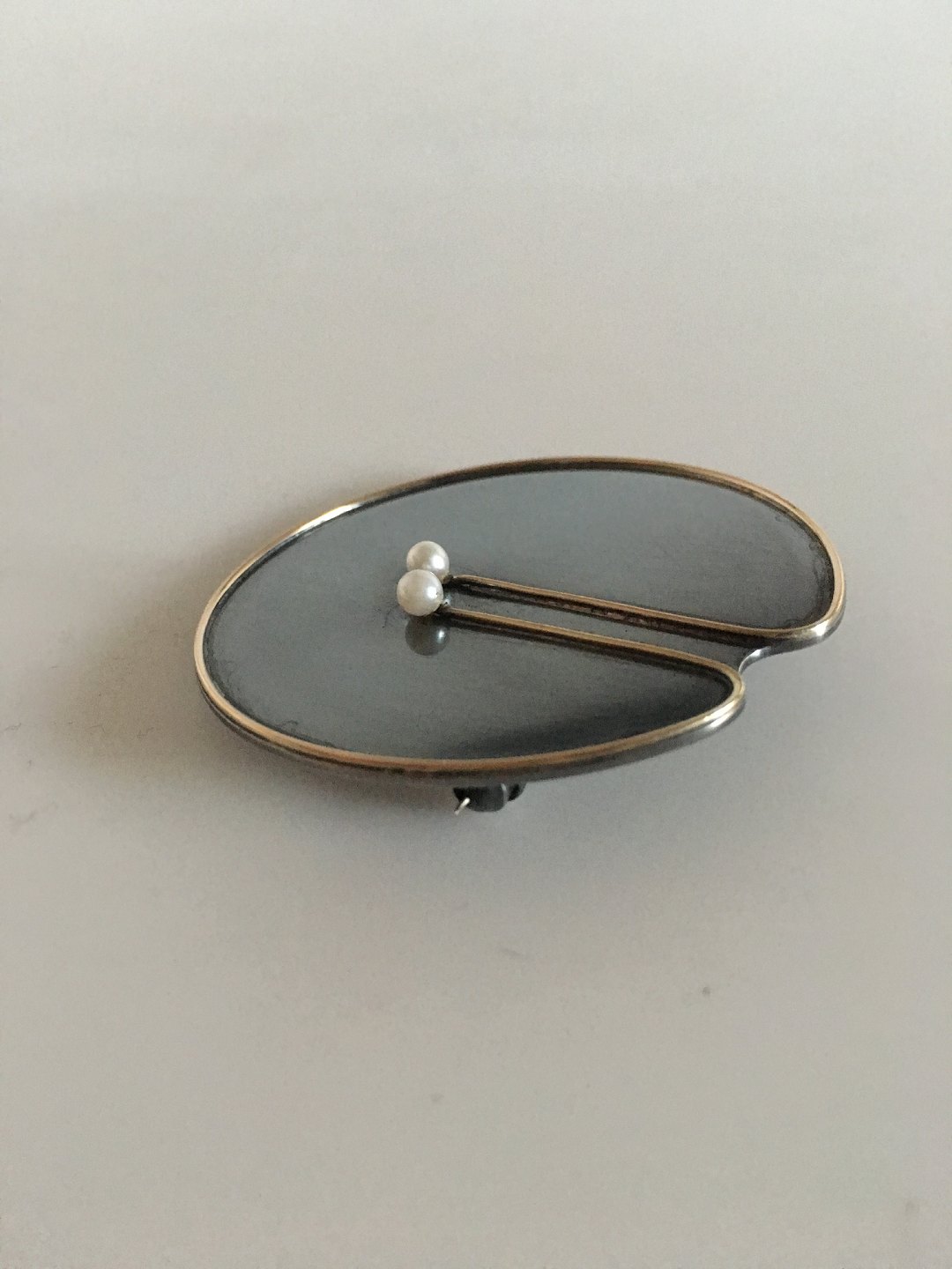 Hans Hansen Brooch in Oxidized Sterling Silver with Pearl and Gilded Rim. Measures 4.7 cm dia / 1 27/32 in. Weighs 18 g / 0.60 oz. In perfect condition.