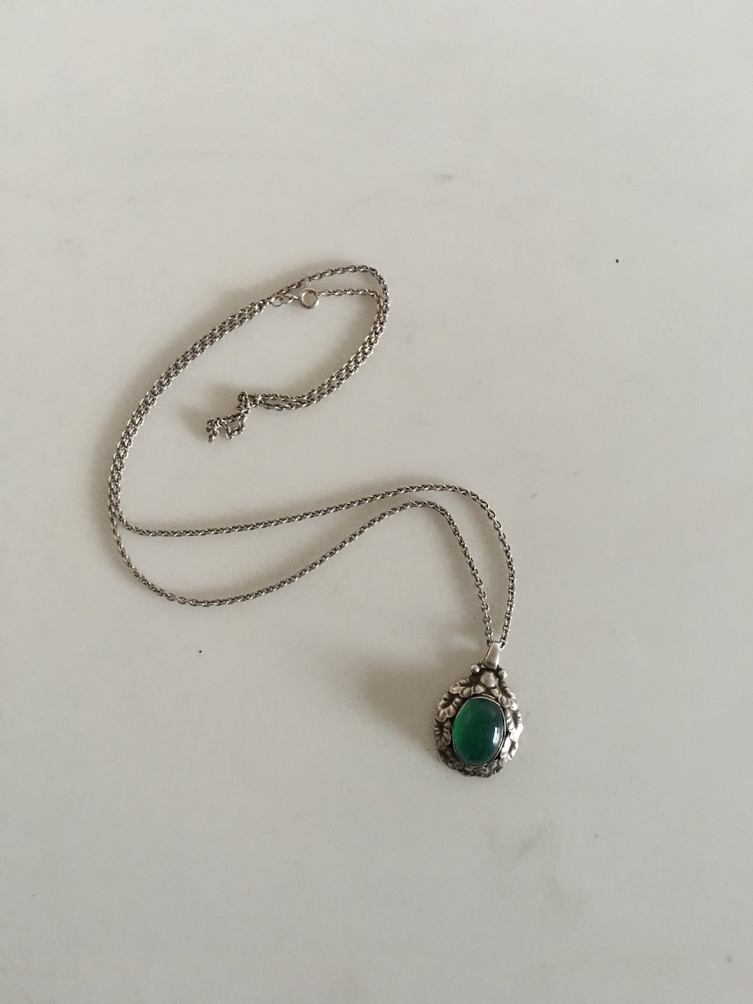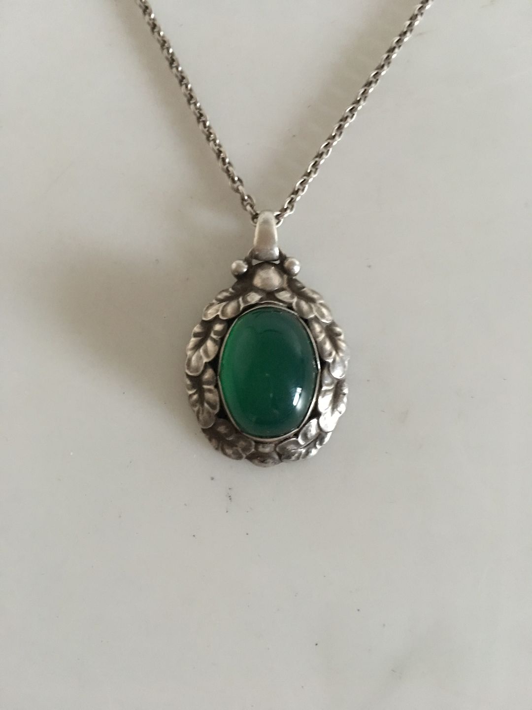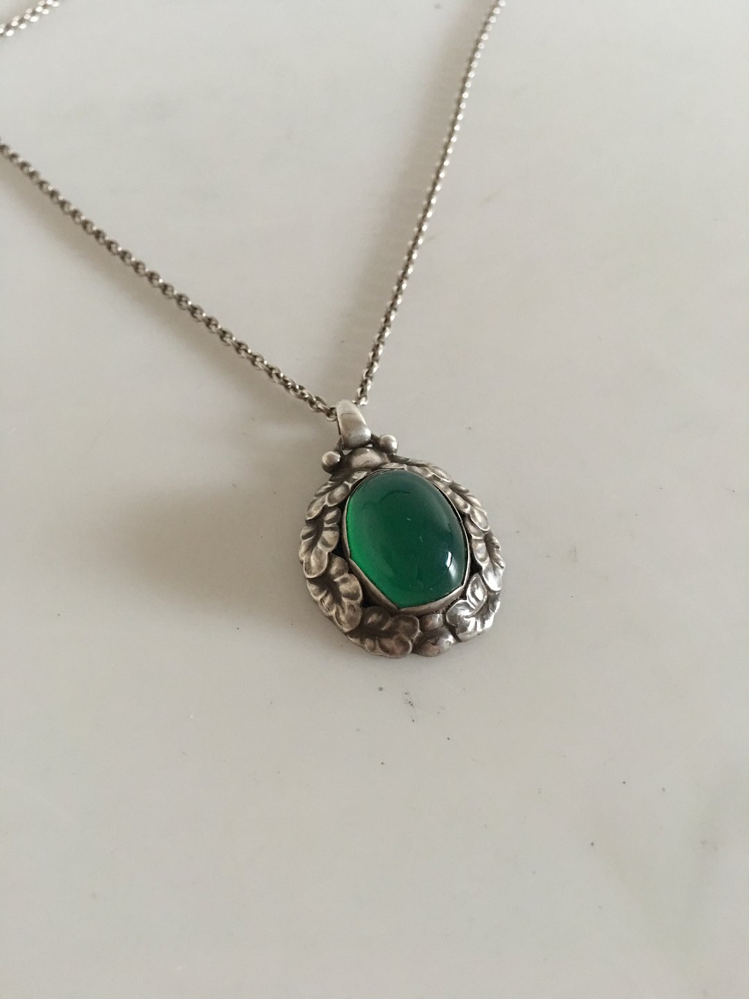 Georg Jensen Halskæde med Sterling Sølv Vedhæng No 56 med Grøn Agat. Kæden er 70 cm L. Vedhæng måler 3 cm. Vejer i alt 16 gram. Fra 1932-1945.