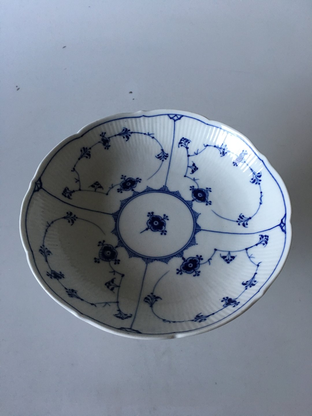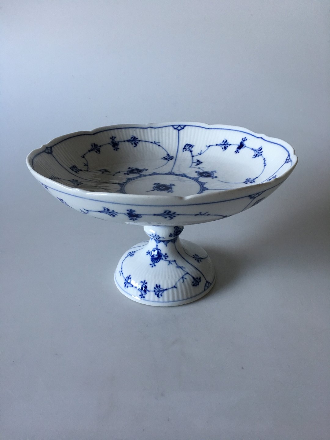Royal Copenhagen Blue Fluted Plain Footed Cake Bowl No 458. 14 cm H (5 33/64"). 23 cm dia (9 1/16"). The bowl has an insignificant hairline on the side otherwise in good condition. 1st Quality.