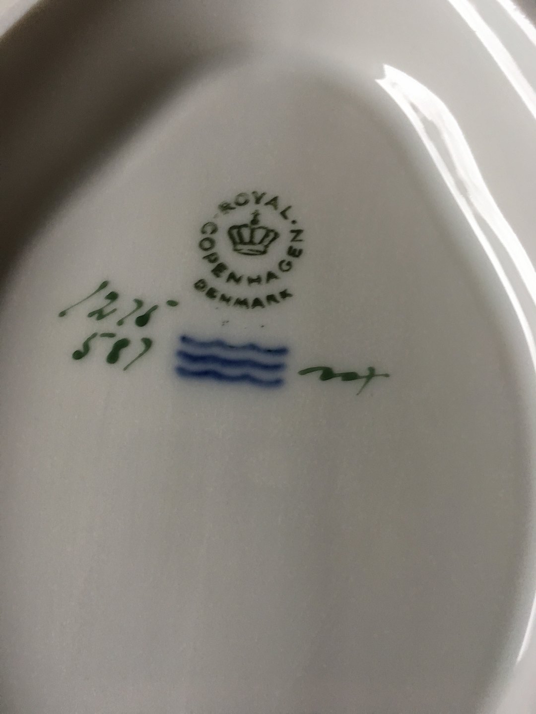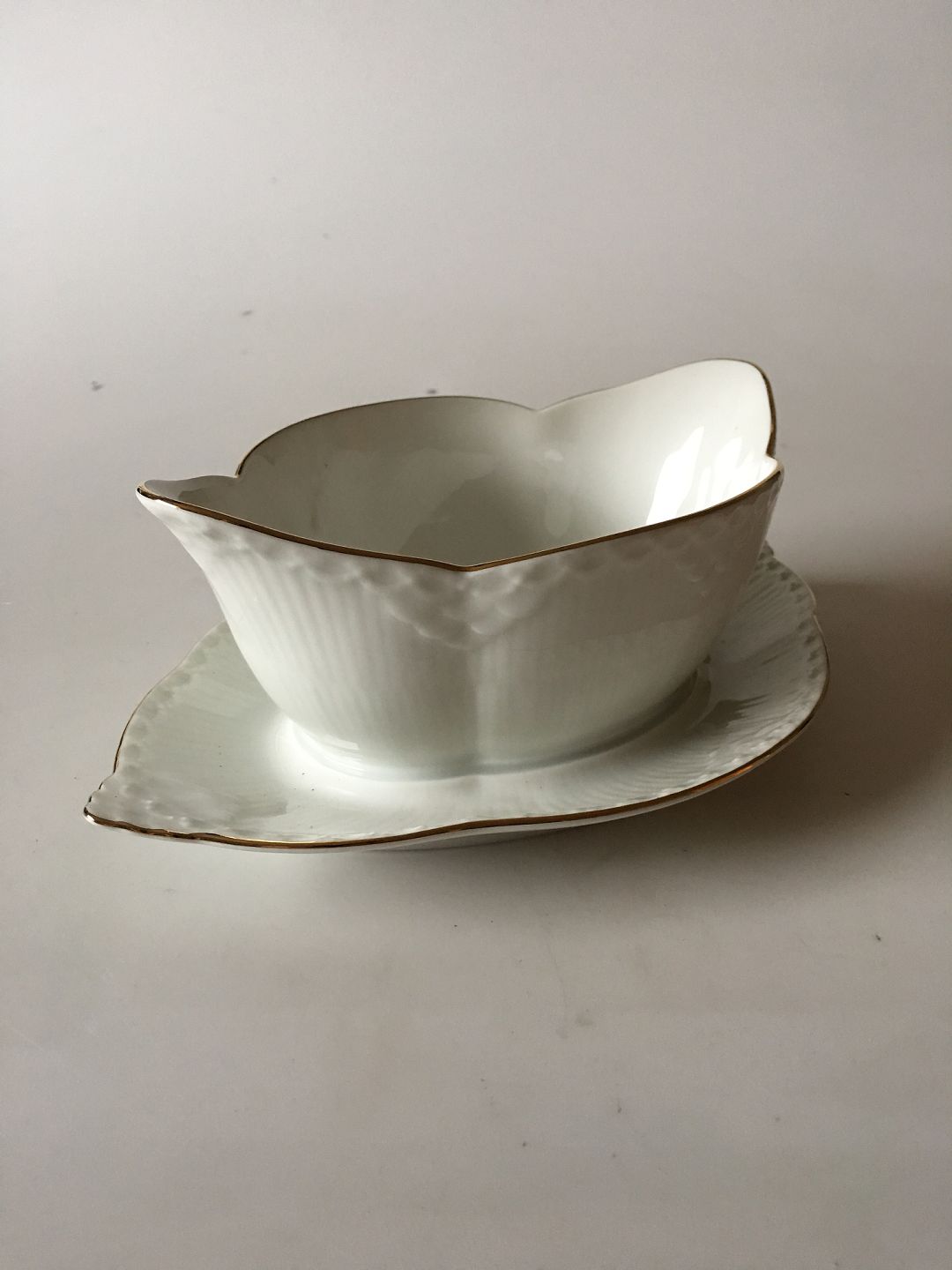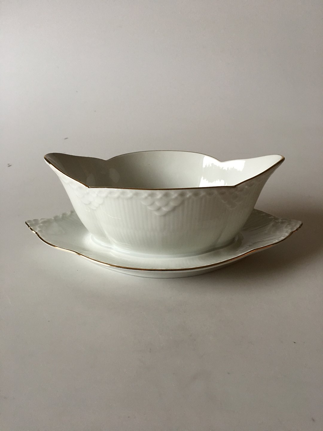 Royal Copenhagen Tradition Hvid Halvblonde m. Guldkant Sauceskål på Fad No 1275/587. Selve Saucebeholderen måler 9 cm H. 19.5 cm Ø. I fin og hel stand.