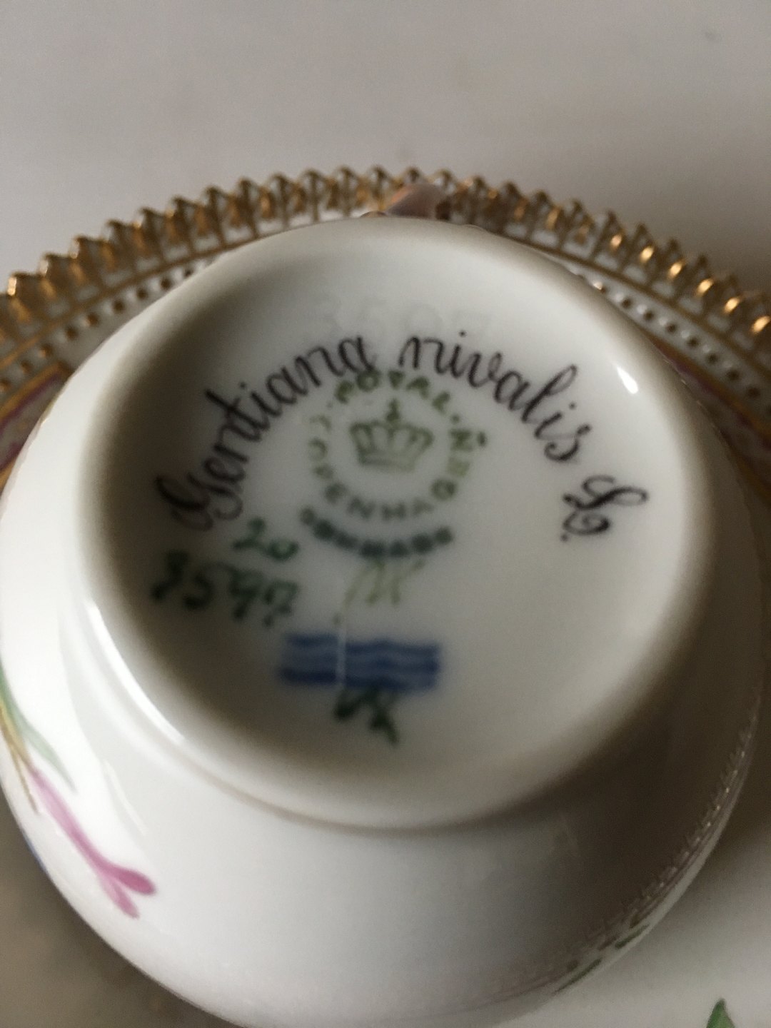Royal Copenhagen Flora Danica Kaffekop og Underkop No 3597. Latinsk Navn: Gentiana Nivalis (Sne Ensian). 2. Sort. I perfekt hel stand. 7 x 7 cm