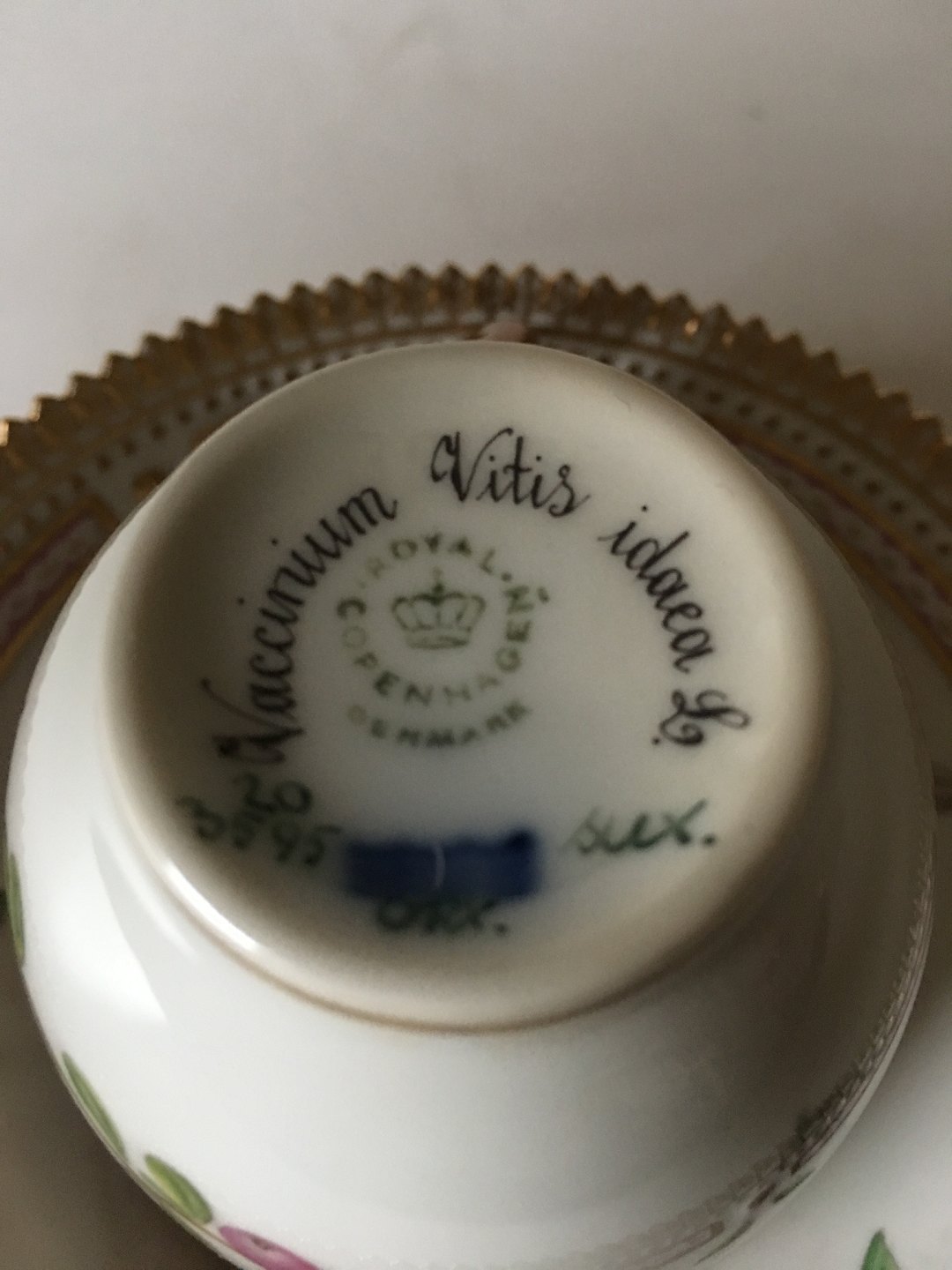 Royal Copenhagen Flora Danica Kaffekop og Underkop No 3595. Latinsk Navn: Vaccinium Vitis Idaea (Tyttebær) 2. Sort. I fin hel stand. 7 x 7 cm