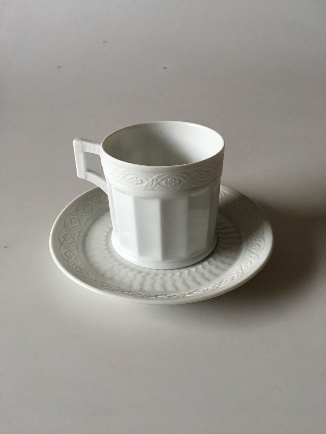 Royal Copenhagen Hvid Vifte Kaffekop og Underkop No. 11572 eller 069. Kop måler 7 x 7 cm. 3. Sort i fin og hel stand.