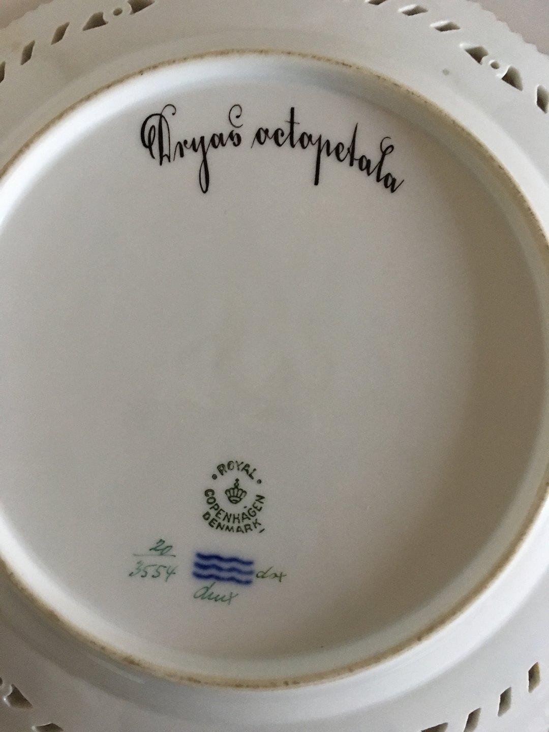 Royal Copenhagen Flora Danica Frokosttallerken No 20/3554 med Gennembrudt Kant. Latinsk Navn: Dryas Octopetala (Alm. Rybelyng). 23 cm . 1. Sort. I perfekt stand.
