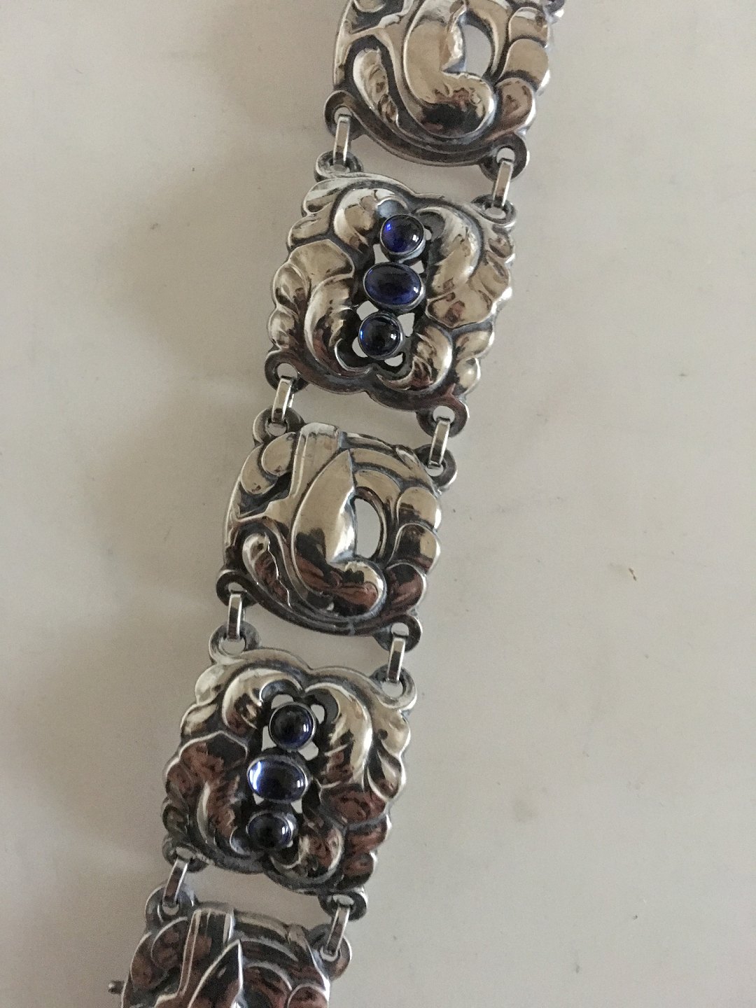 Georg Jensen Sterling Sølv Armbånd No 32 med Syntetisk Safir. Måler 19 cm. Vejer 53,7 gram. Fra efter 1945.