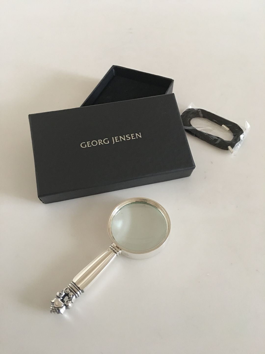 Georg Jensen Sterling Silver Acorn Magnifying Glass. In box with cord so it can hang around your neck. In new condition, never been used. Measures 10 cm L (3 15/16"). 4.3 cm dia (1 11/16"). Weighs 40 grams (1.40 oz).