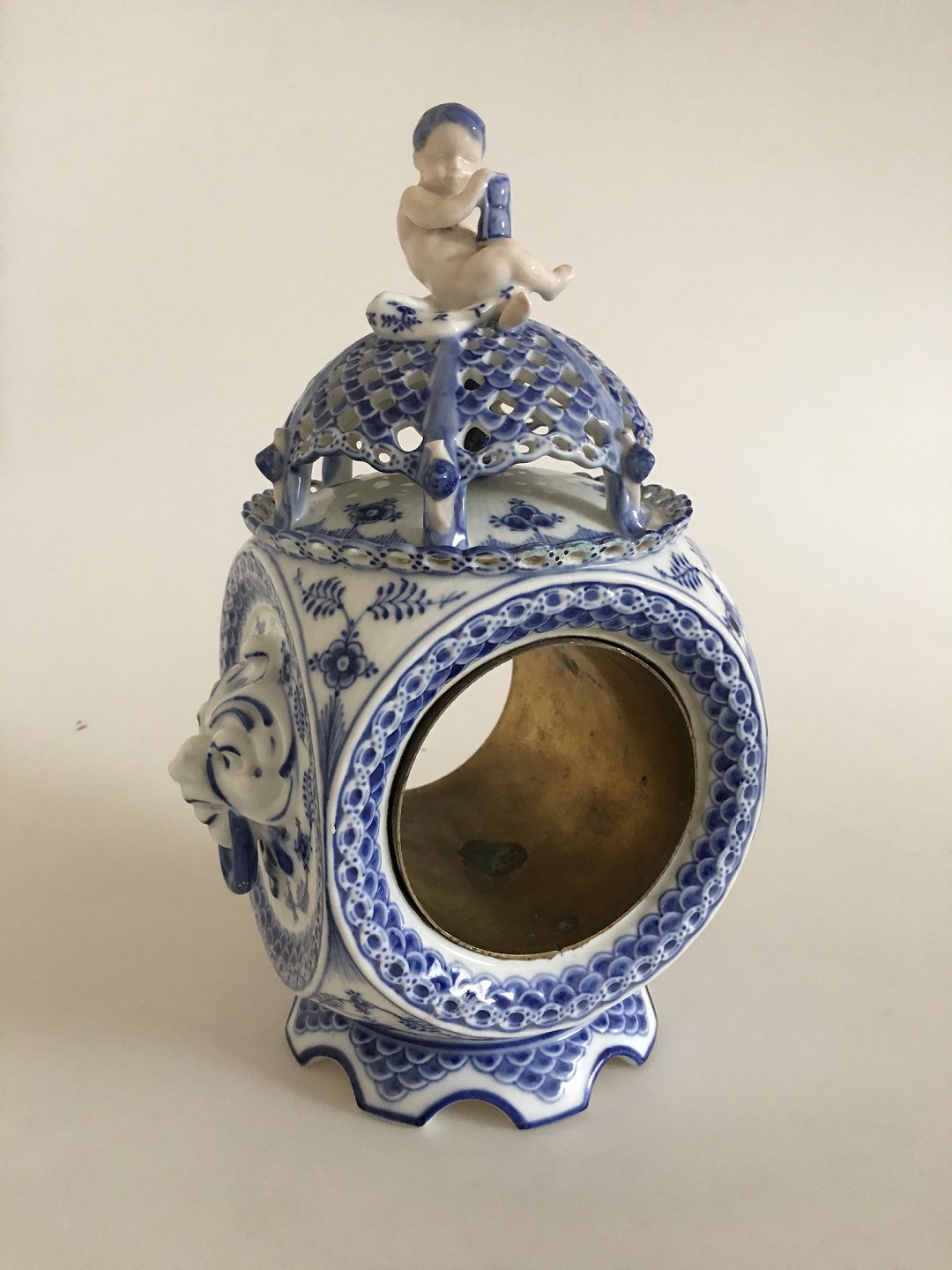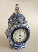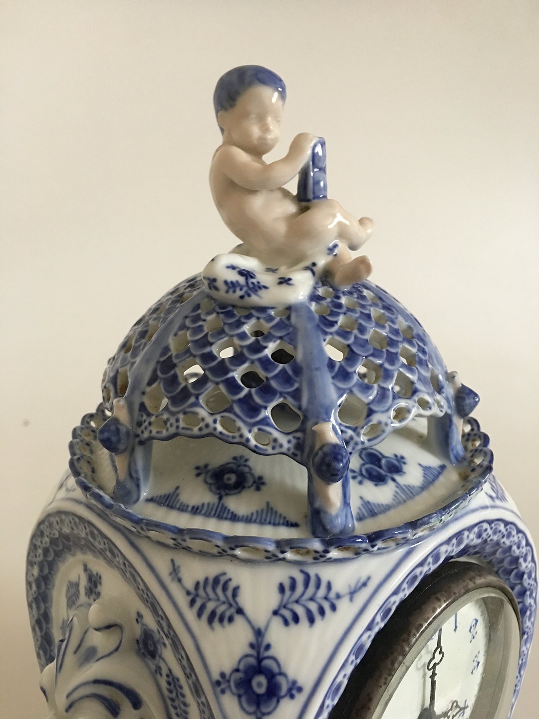 “Musselmalet Helblonde” kaminur af porcelæn, dekoreret i underglasur blå, sider modellerede med maskaroner, topprydelse i form af putto siddende med timeglas. Urskive af hvid emalje med romer- og arabertal. Royal Copenhagen 1017.. H. 28 cm. Uret har en kraftig reparation på soklen, og en lidt mindre på blonde borden over urskiven. Se billeder.