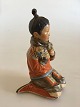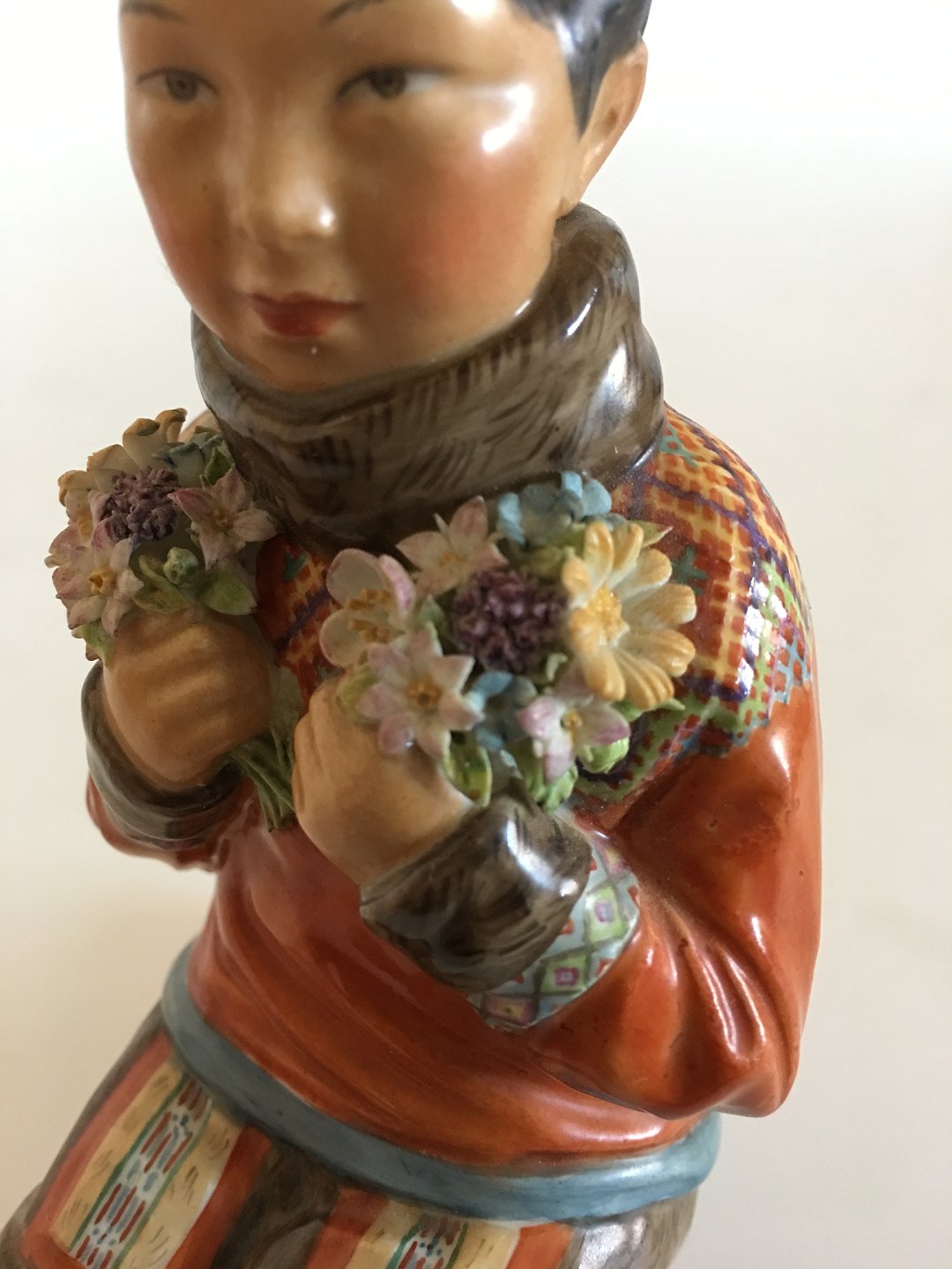 Royal Copenhagen Overglaze Figurine Greenland Girl No 12415. Measures 15cm and is in good condition, but has chip on flower. Designed by Carl Martin-Hansen.