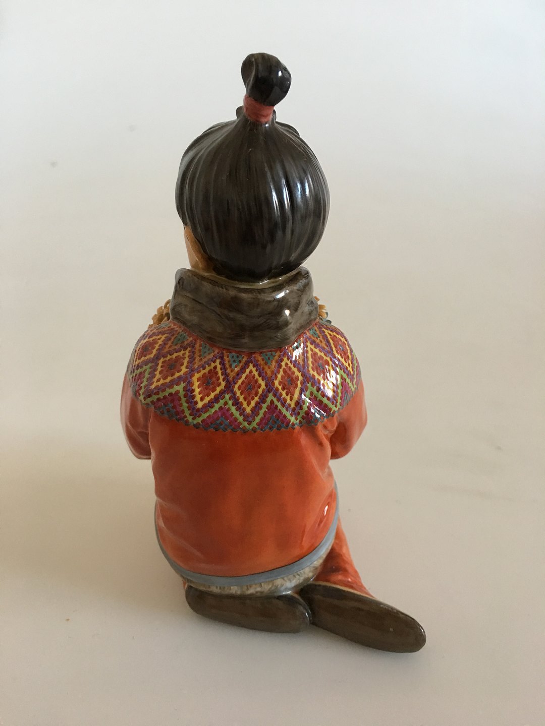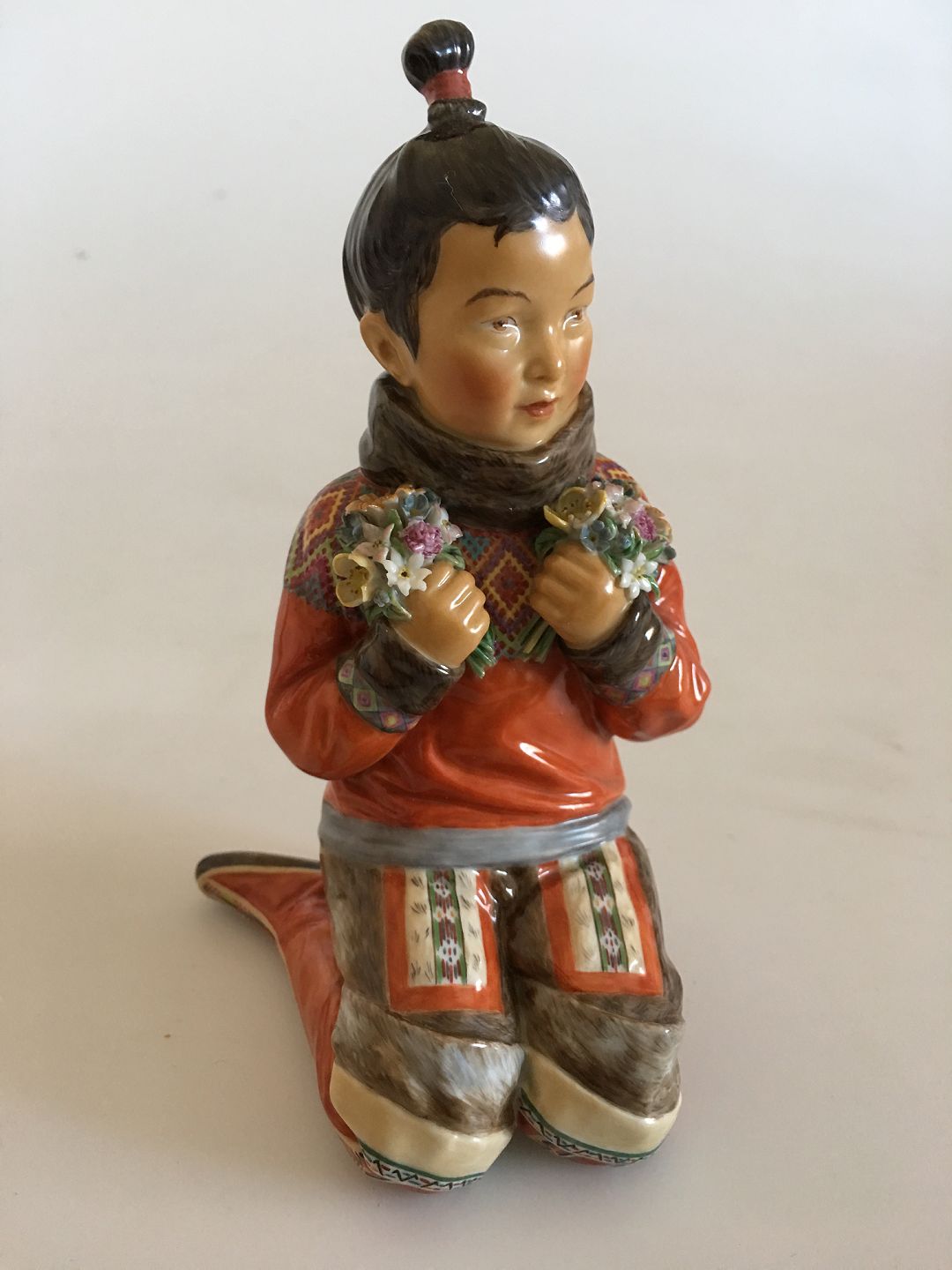 Royal Copenhagen Overglaze Figurine Greenland Girl No 12415. Measures 15cm and is in good condition, but has chip on flower. Designed by Carl Martin-Hansen.