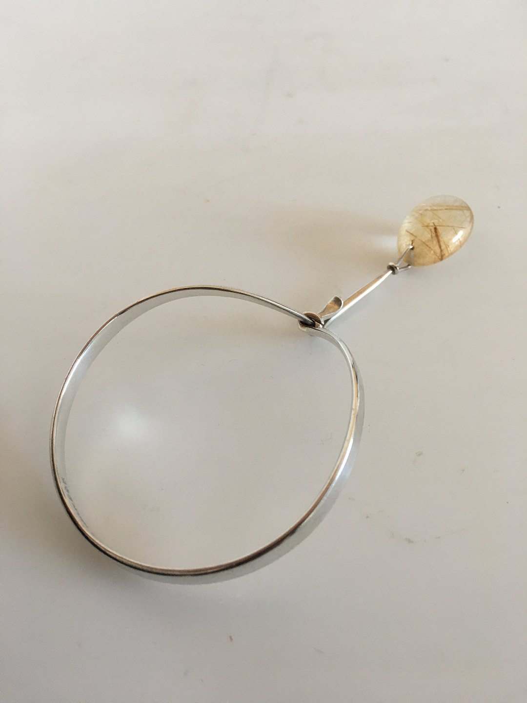 Georg Jensen Sterling Sølv Armring No 205 og Vedhæng No 130 med Rutil Quartz. Designet Vivianna Torun Bülow-Hübe. Indre diameter på 5,5 cm. Vejer tilsammen 20,8 gram. Stenen har et lille afslag ved hullet.