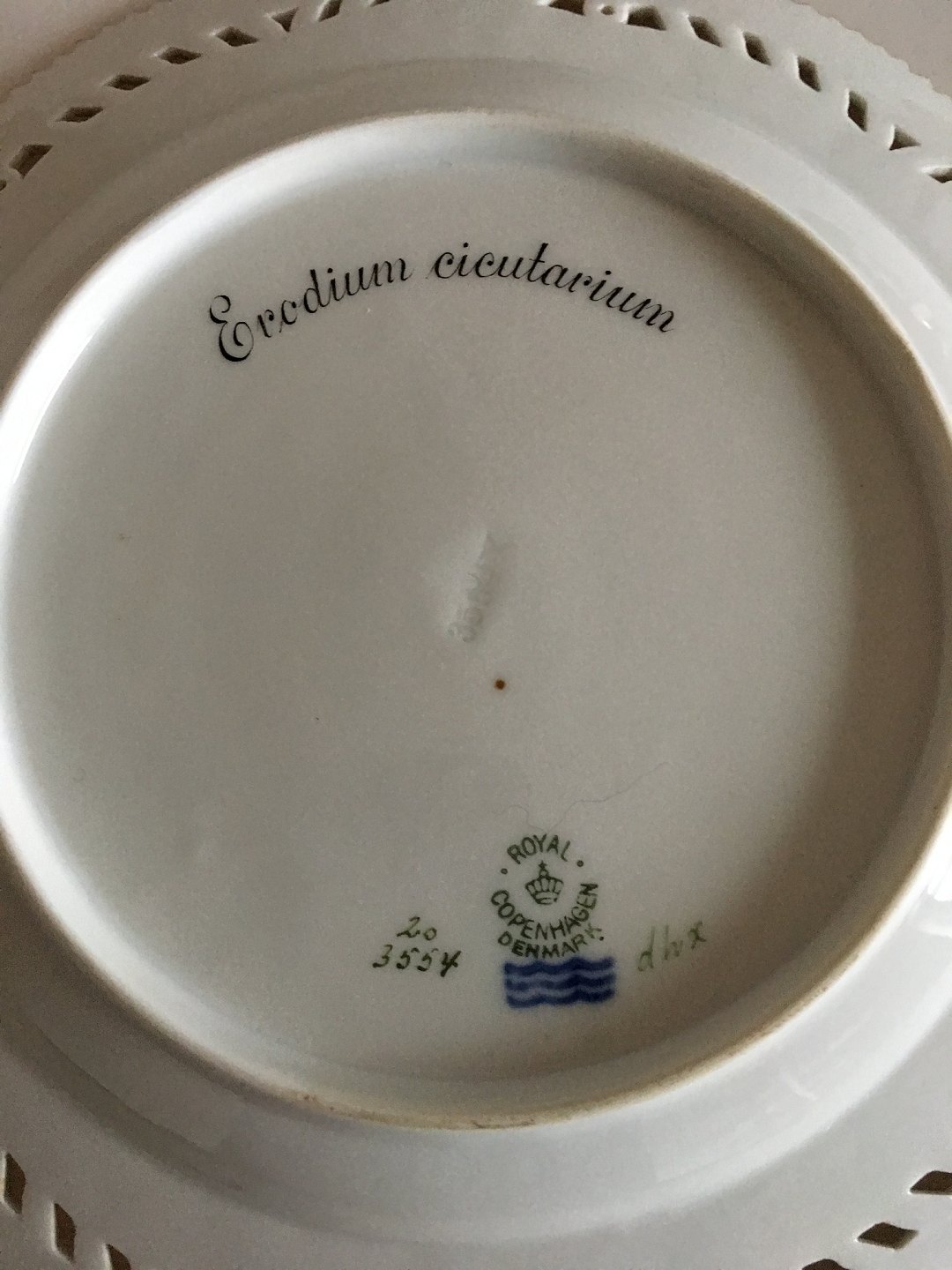 Royal Copenhagen Flora Danica Gennembrudt Frokosttallerken No 20/3554. 23 cm Ø. Latinsk Navn: Erodium Cicutarium (Hejrenæb). Med gammelt stempel fra 1923-1934.
