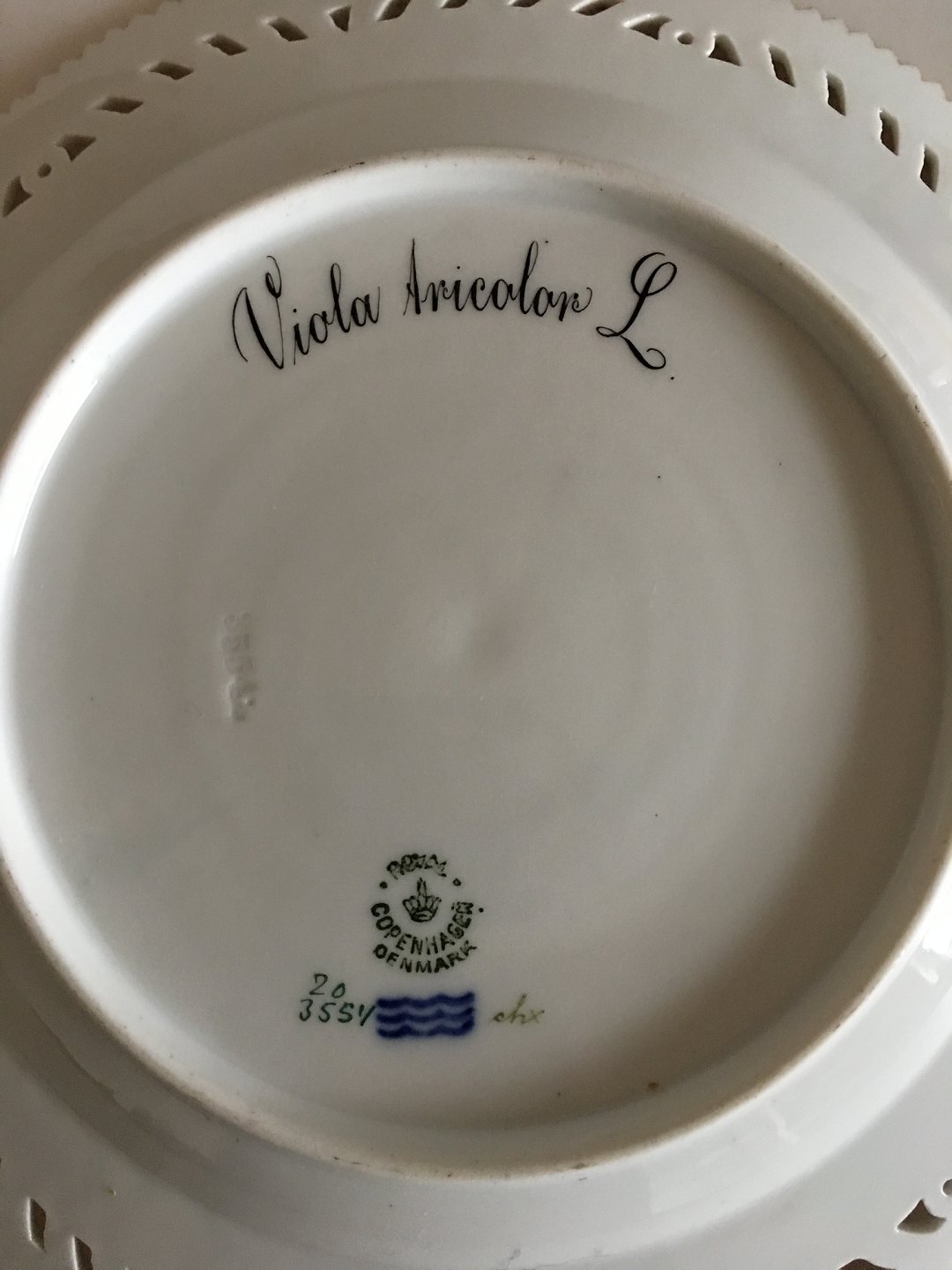 Royal Copenhagen Flora Danica Gennembrudt Frokosttallerken No 20/3554. 23 cm Ø. Latinsk Navn: Viola Tricolor (Alm. Stedmoderblomst) med gamle stempler fra 1923-1934.