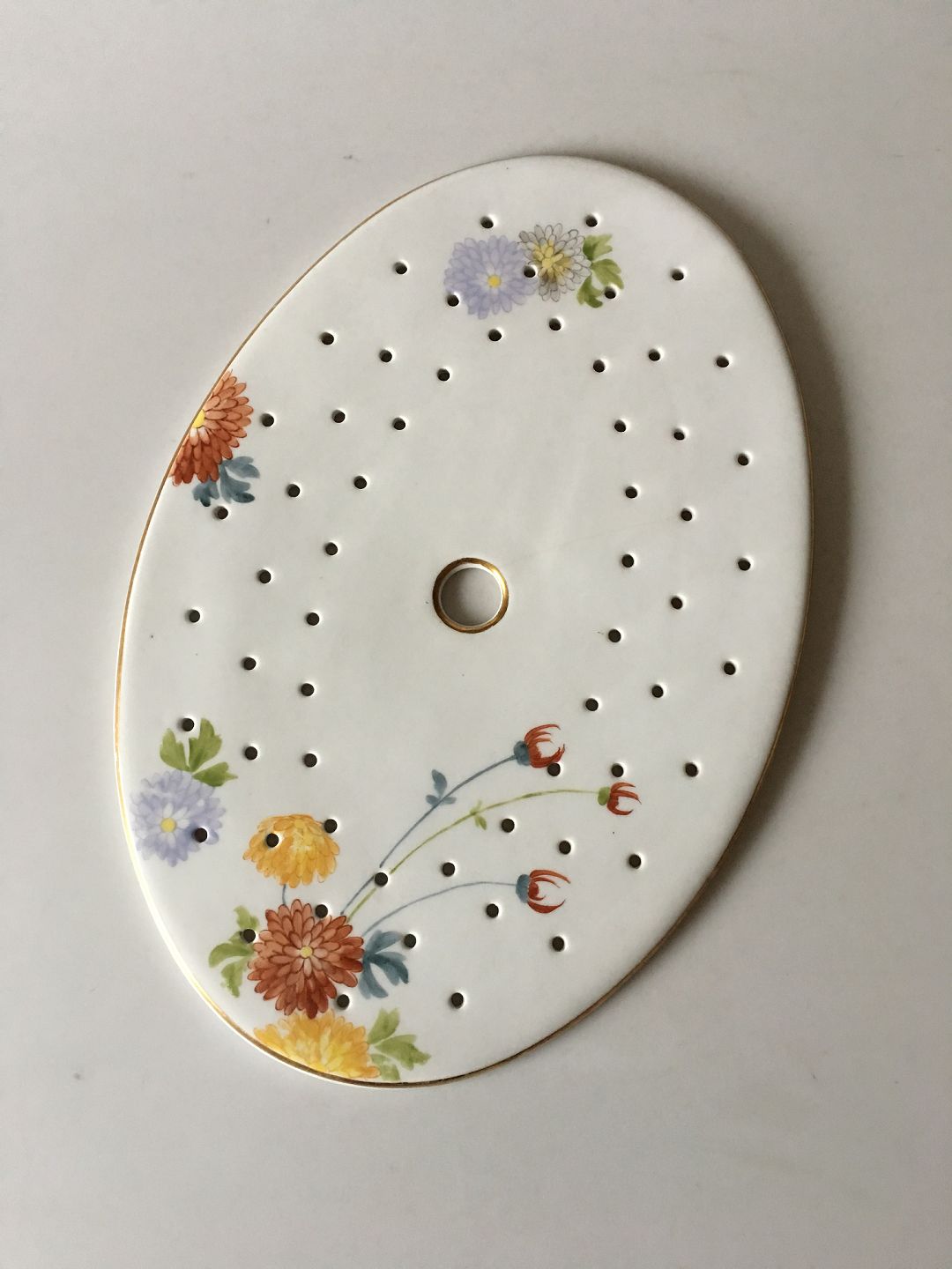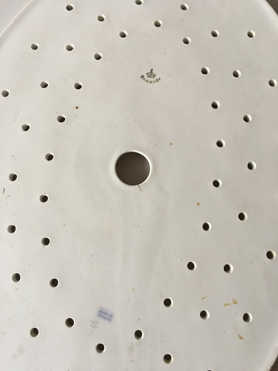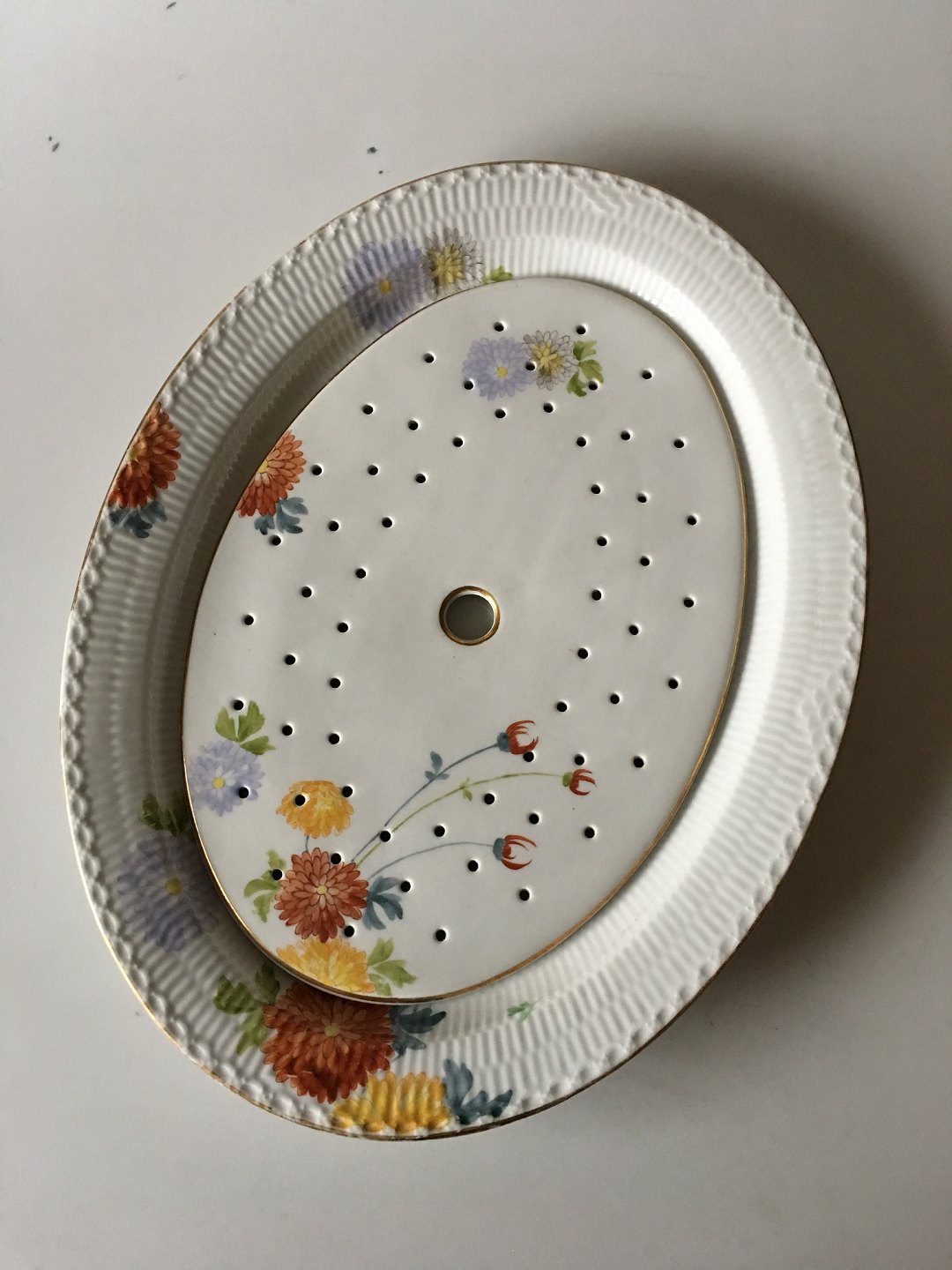 Royal Copenhagen No 93 White with Flowers and Gold Fish Grate 37 cm (14 9/16"). Fits the oval serving platter 47 cm. Has a hairline crack. Rare dinner service from 1894-1898. Handpainted