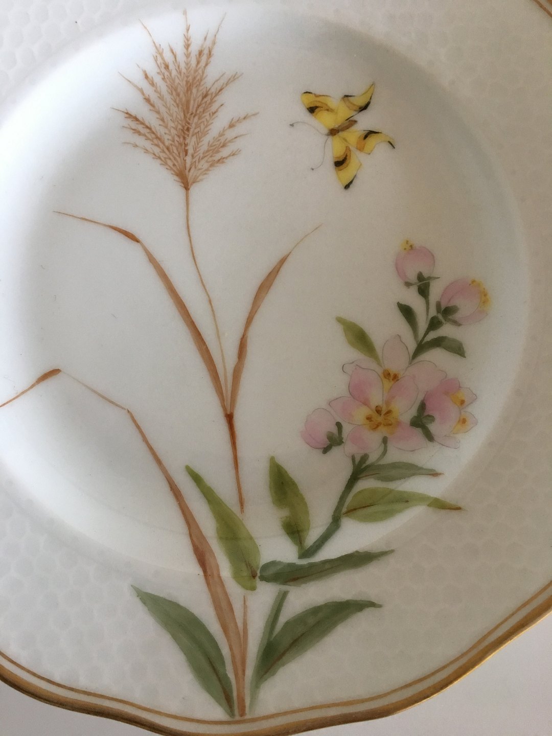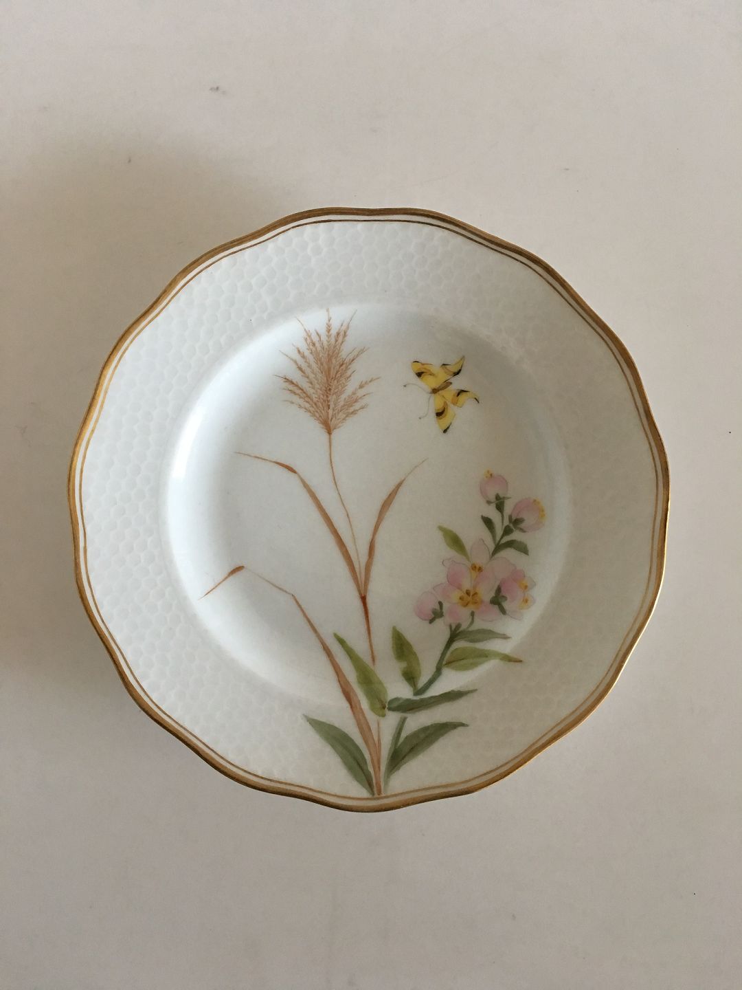 Royal Copenhagen Tallerken No 166/2031 Guldkant med Håndmalet Blomst og Sommerfugl. 21 cm Ø. I pæn hel stand, med kun en smule slid på guldet.