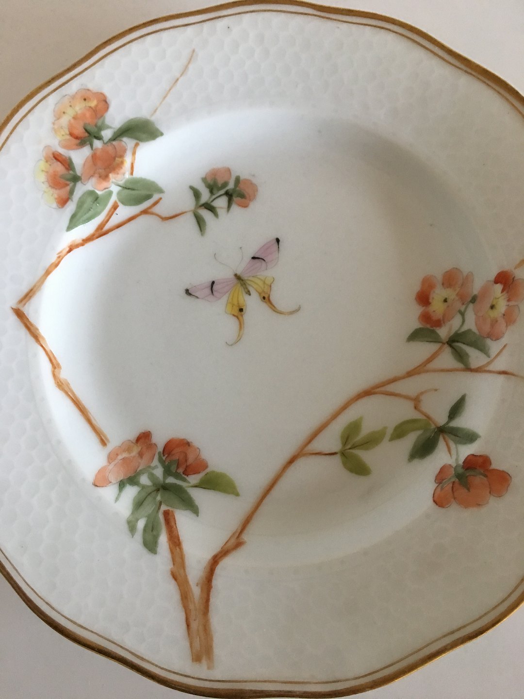 Royal Copenhagen Tallerken No 166/2031 Guldkant med Håndmalet Blomst og Sommerfugl. 21 cm Ø. I pæn hel stand, med kun en smule slid på guldet