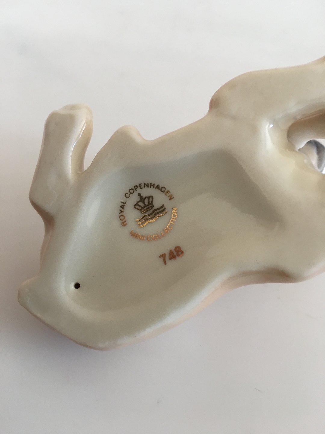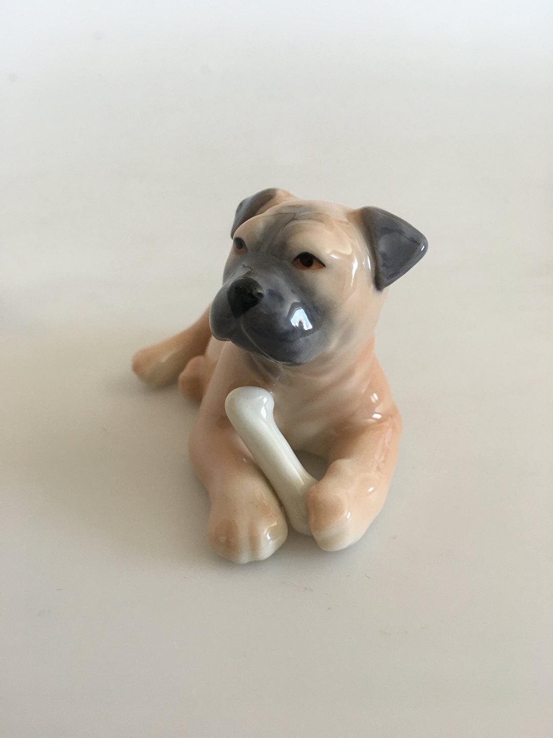 Royal Copenhagen "Puppy Collection Boxer Figurine No 748. Kreeret af Allan Therkelsen. 8 cm L. I perfekt stand og i original æske.