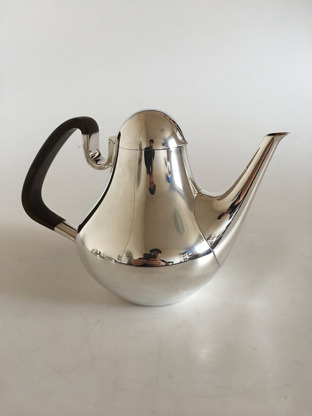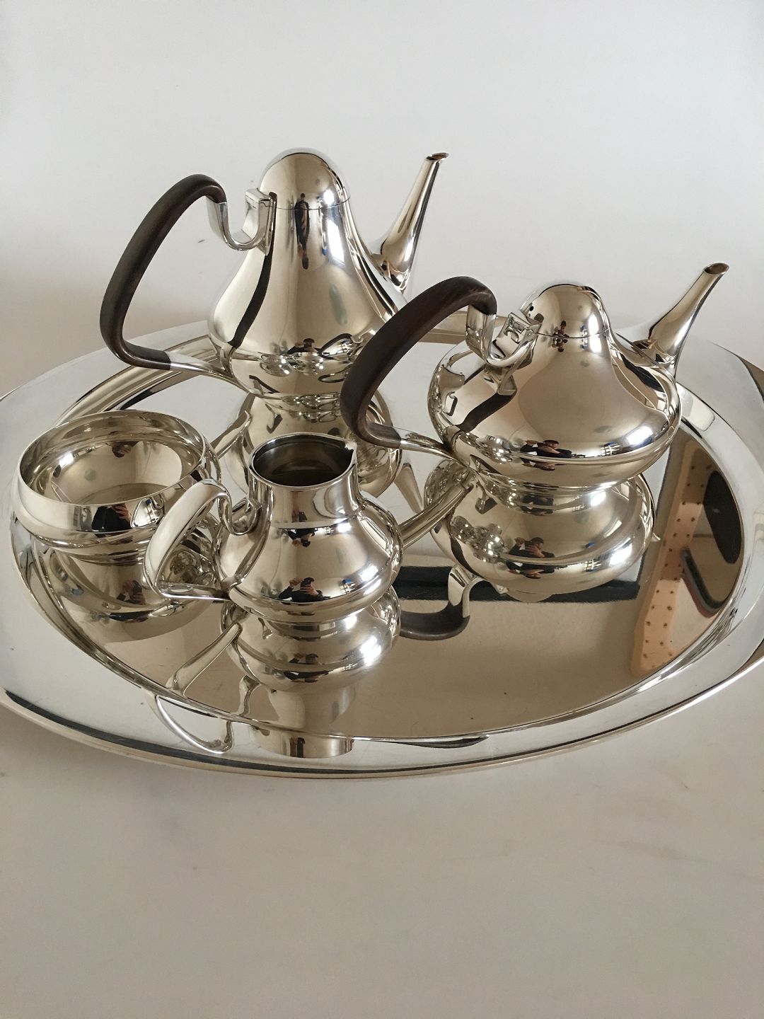 Georg Jensen Sterling Sølv Henning Koppel Te og Kaffesæt med Tekande, Kaffekande, Bakke, Flødekande og Sukkerskål No 1017. Sættet er mærket med engelske importstempler og kan dateres til 1964. Tekande med Håndtag af Guayacan Træ 12 cm H. 88 cl. Vejer 692 gram. Kaffekande med Håndtag af Guayacan Træ 15 cm H. Vejer 670 gram. Flødekande 7.5 cm H. Vejer 260 gram. Sukkerskål 10.5 cm Ø. Vejer 176 gram. Bakke 52 x 45.5 cm, Vejer 2,8 Kg. Sættet er i perfekt stand.