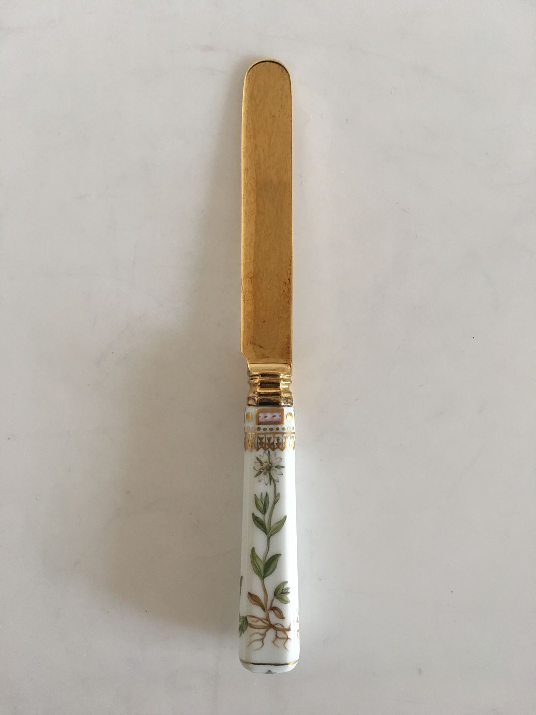 Royal Copenhagen Flora Danica Dessert Knife 20 cm L ( 7 7/8"). In porcelain with top in gilded sterling silver made by Anton Michelsen. The knife has a small hairline (look to picture for detail)