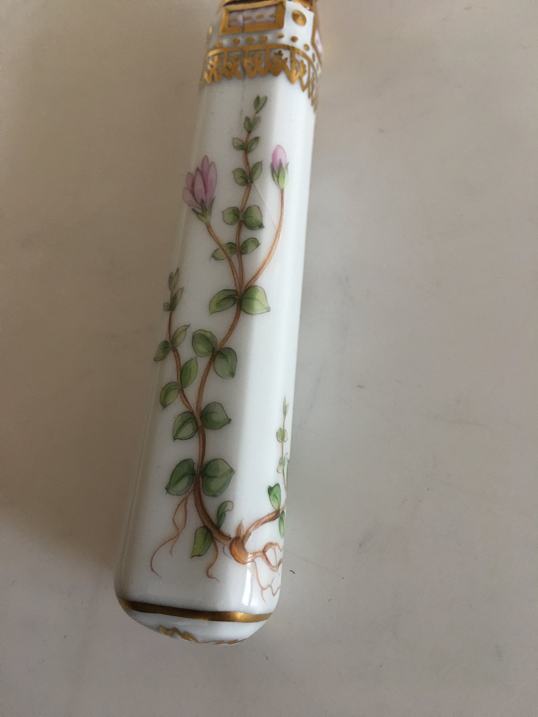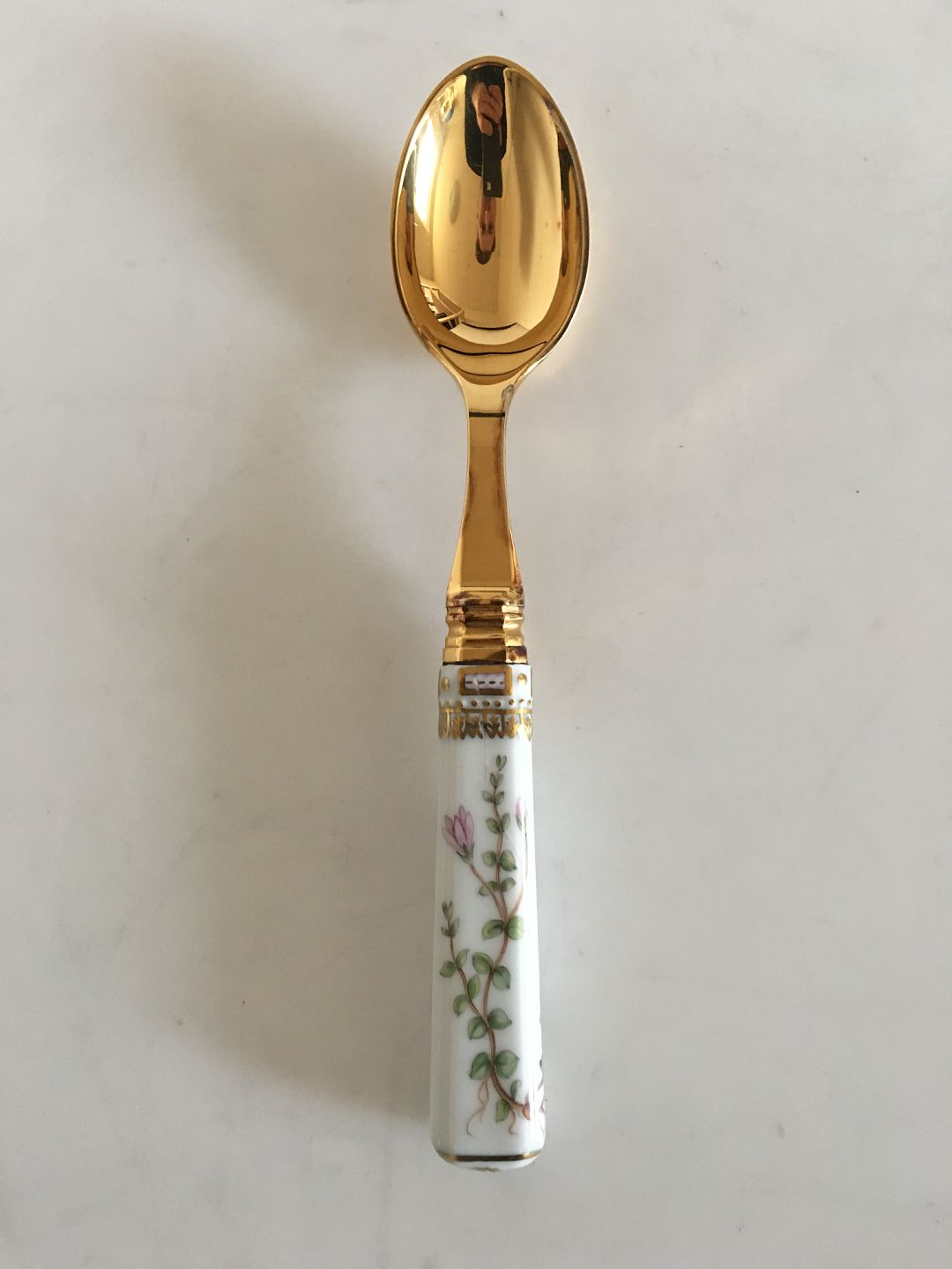 Royal Copenhagen Flora Danica Spoon 19 cm L (7 31/64"9. In porcelain with top in gilded sterling silver made Georg Jensen. The spoon has a small hairline (look to picture for detail)