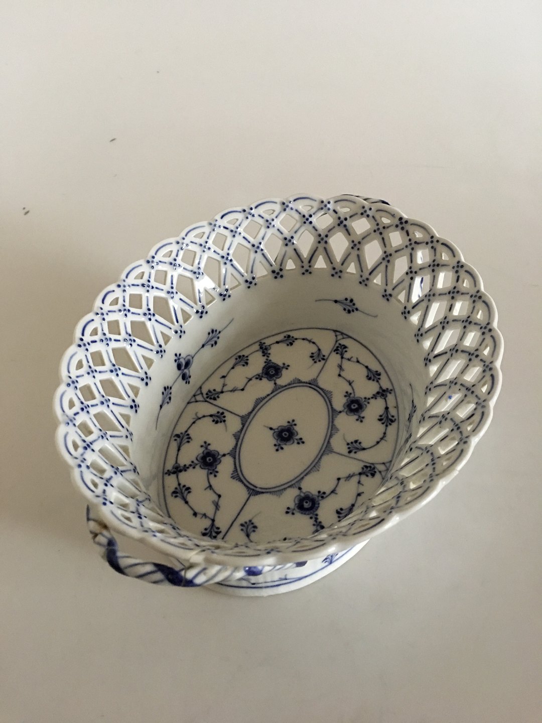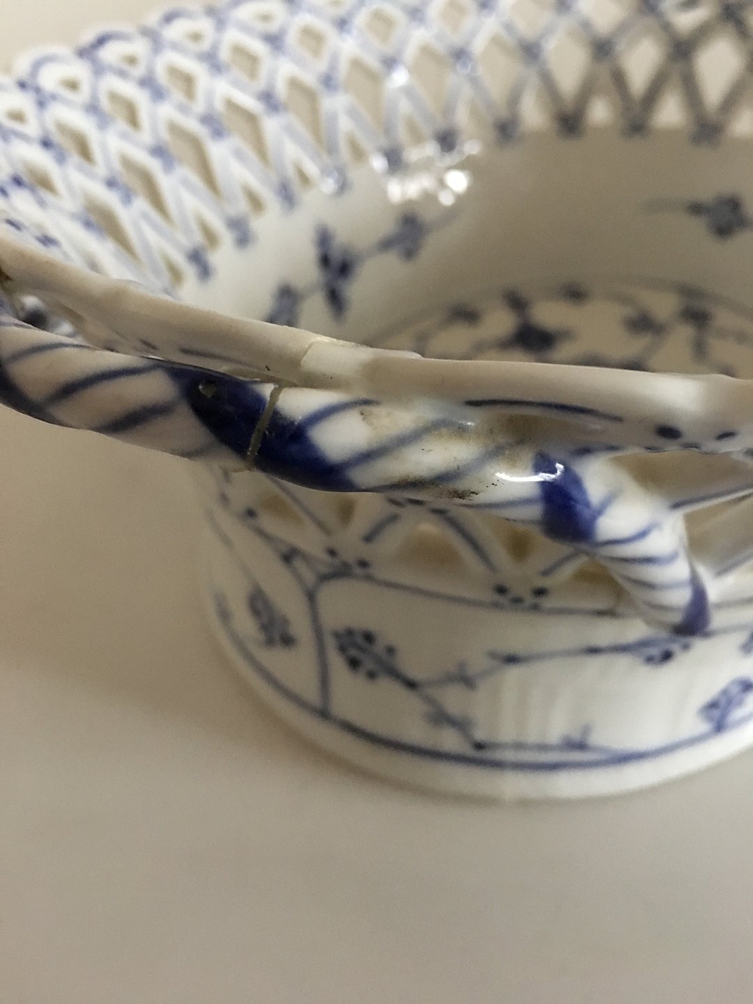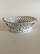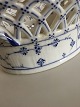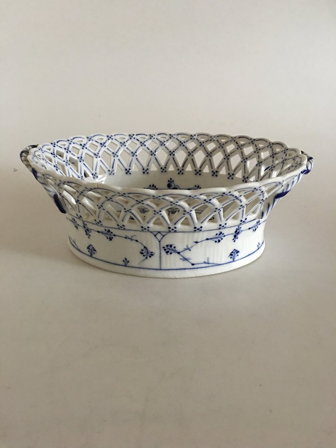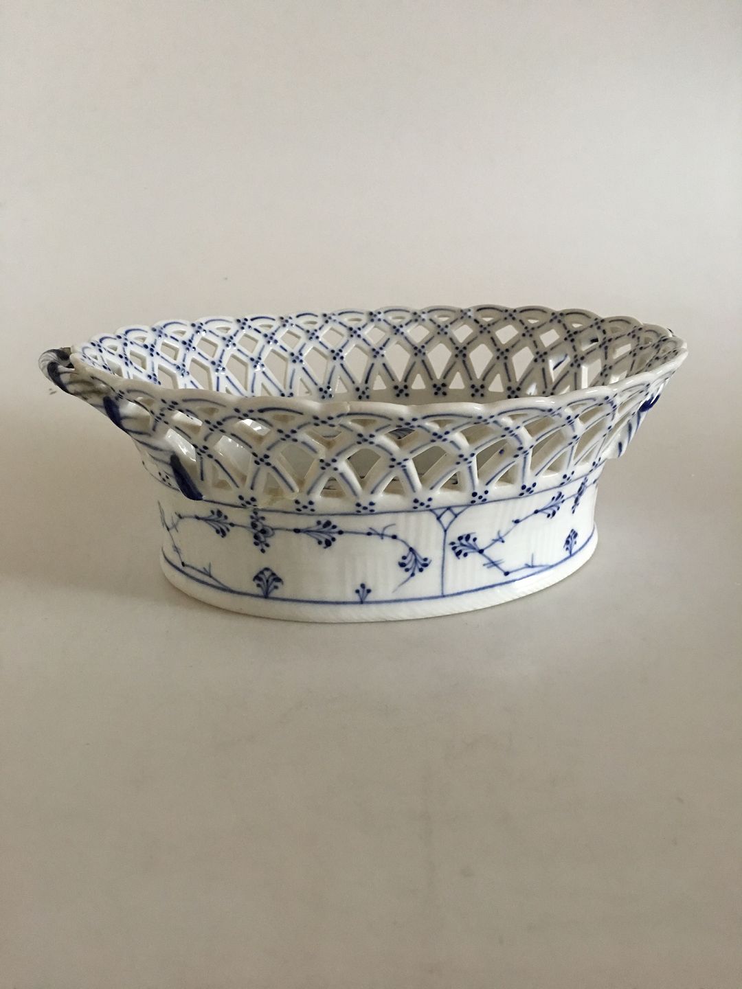Royal Copenhagen Musselmalet Riflet Oval Frugtskål med Gennembrudt Kant No 1057. 9 cm Høj. 25 cm Ø. 1. Sortering. Skålen har en stor reparation da en del af siden og op til det den ene sidehank har været knækket af (se billede for detalje)