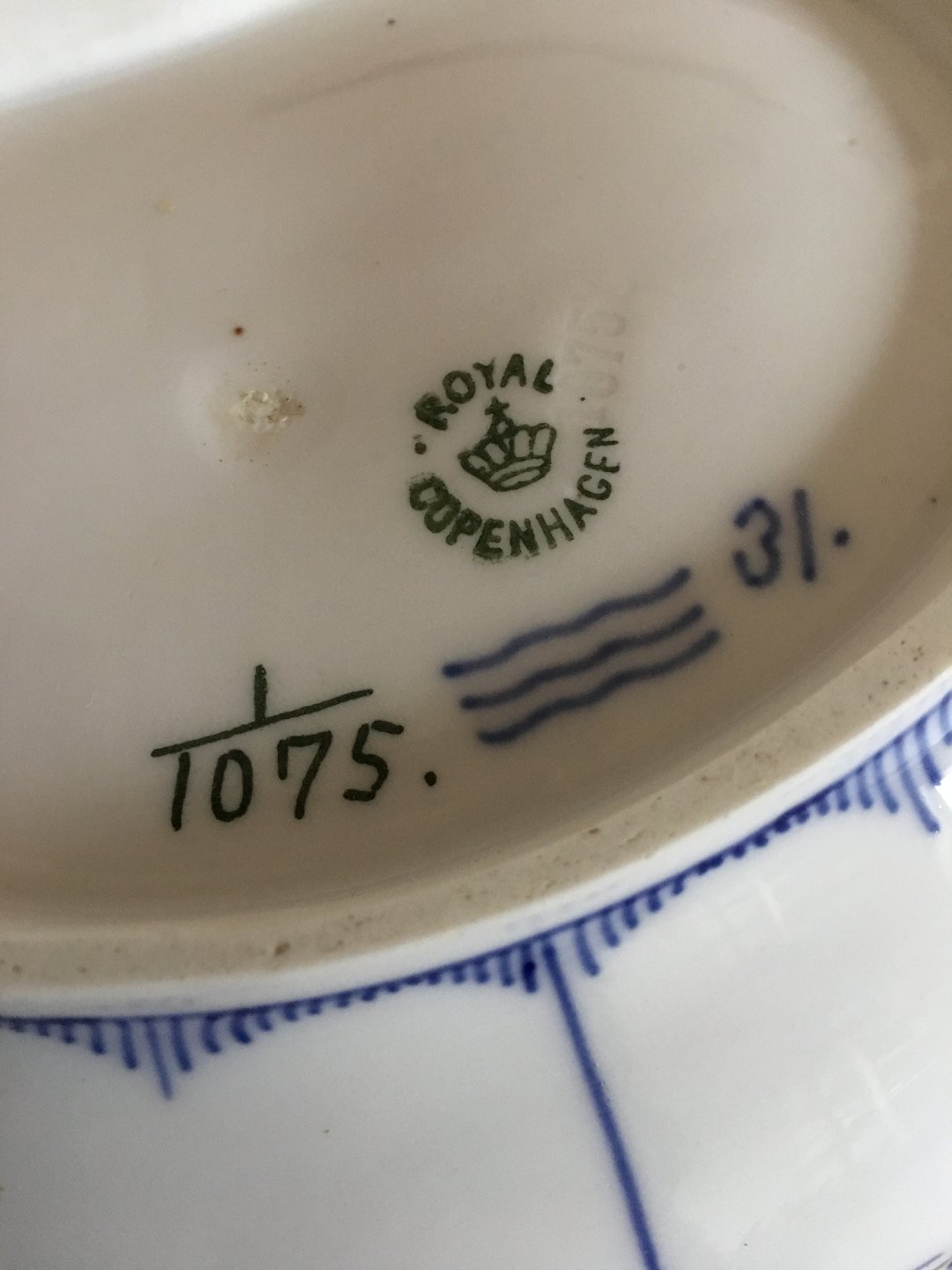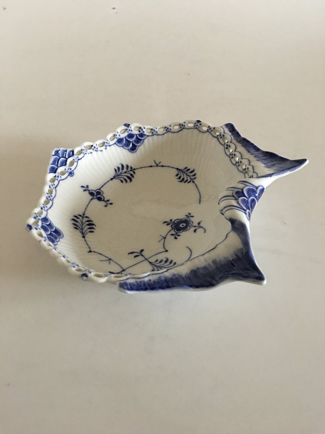Royal Copenhagen Blue Fluted Full Lace Bowl No 1075. 19 x 16 cm. 1st Quality. In nice whole condition, but has a few burning mistakes on the lace part (look to picture for detail).