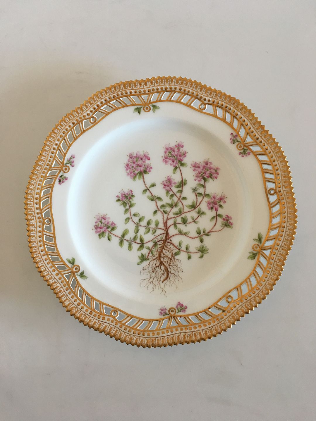 Royal Copenhagen Flora Danica Frokosttallerken No 3554 with Gennembrudt Kant. 22.5 cm Ø. I fin hel stand. Latinsk Navn: Thymus Serpyllum (Smalbladet Timian). Fra 1894-1900