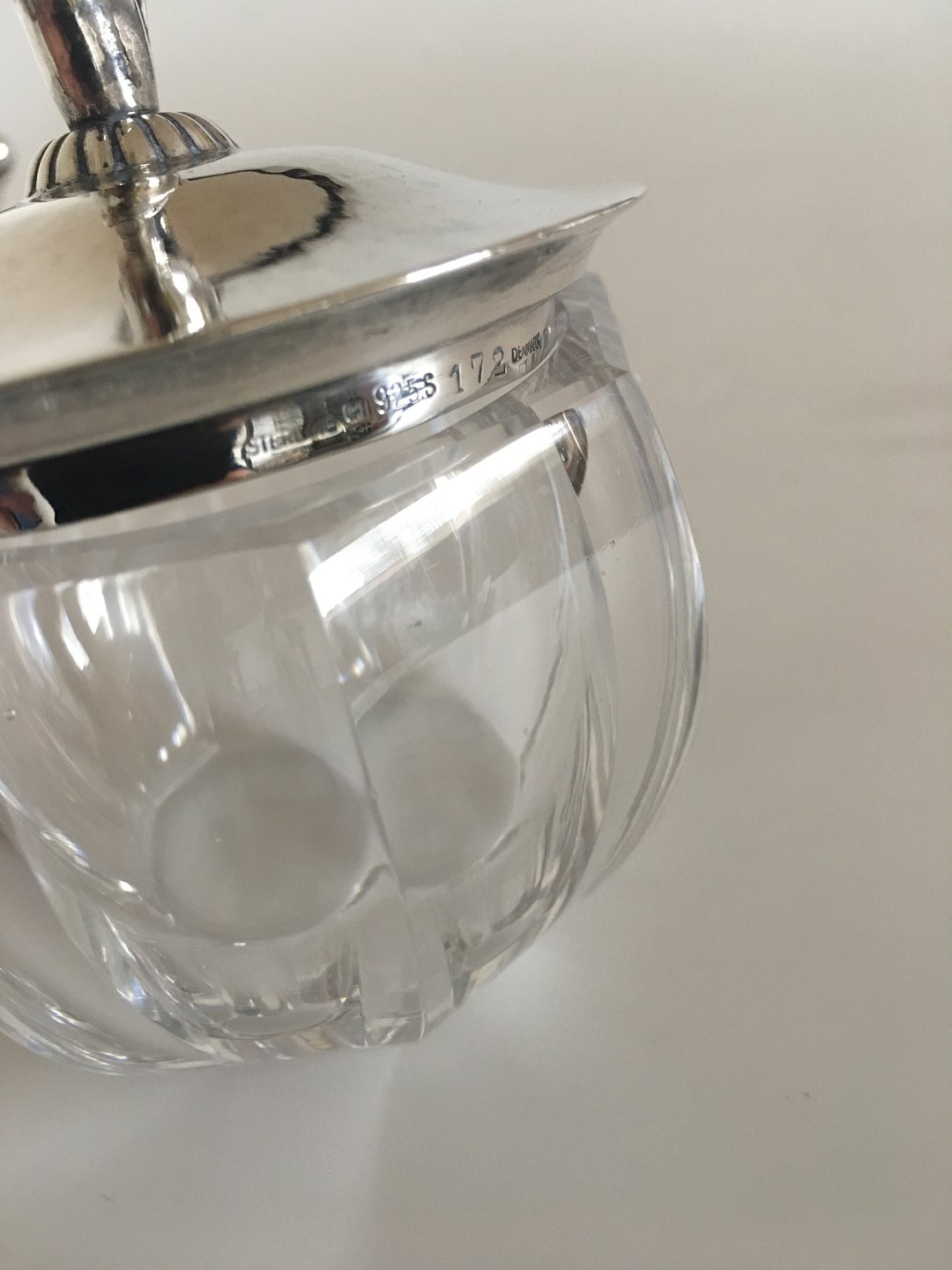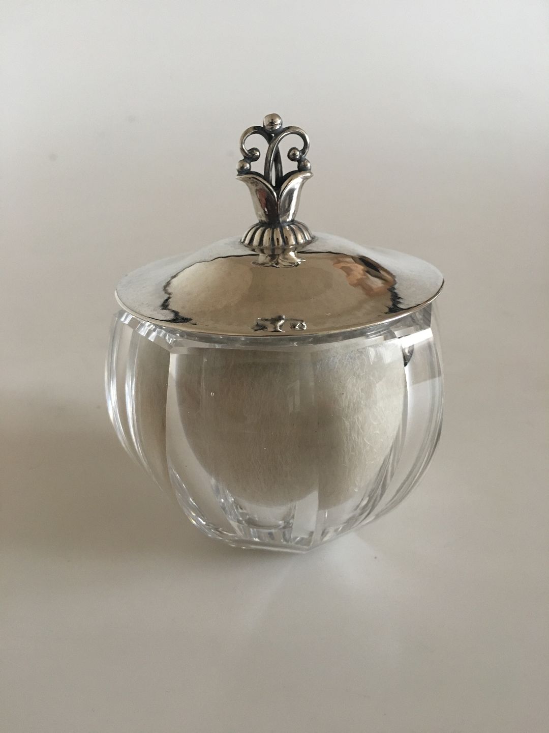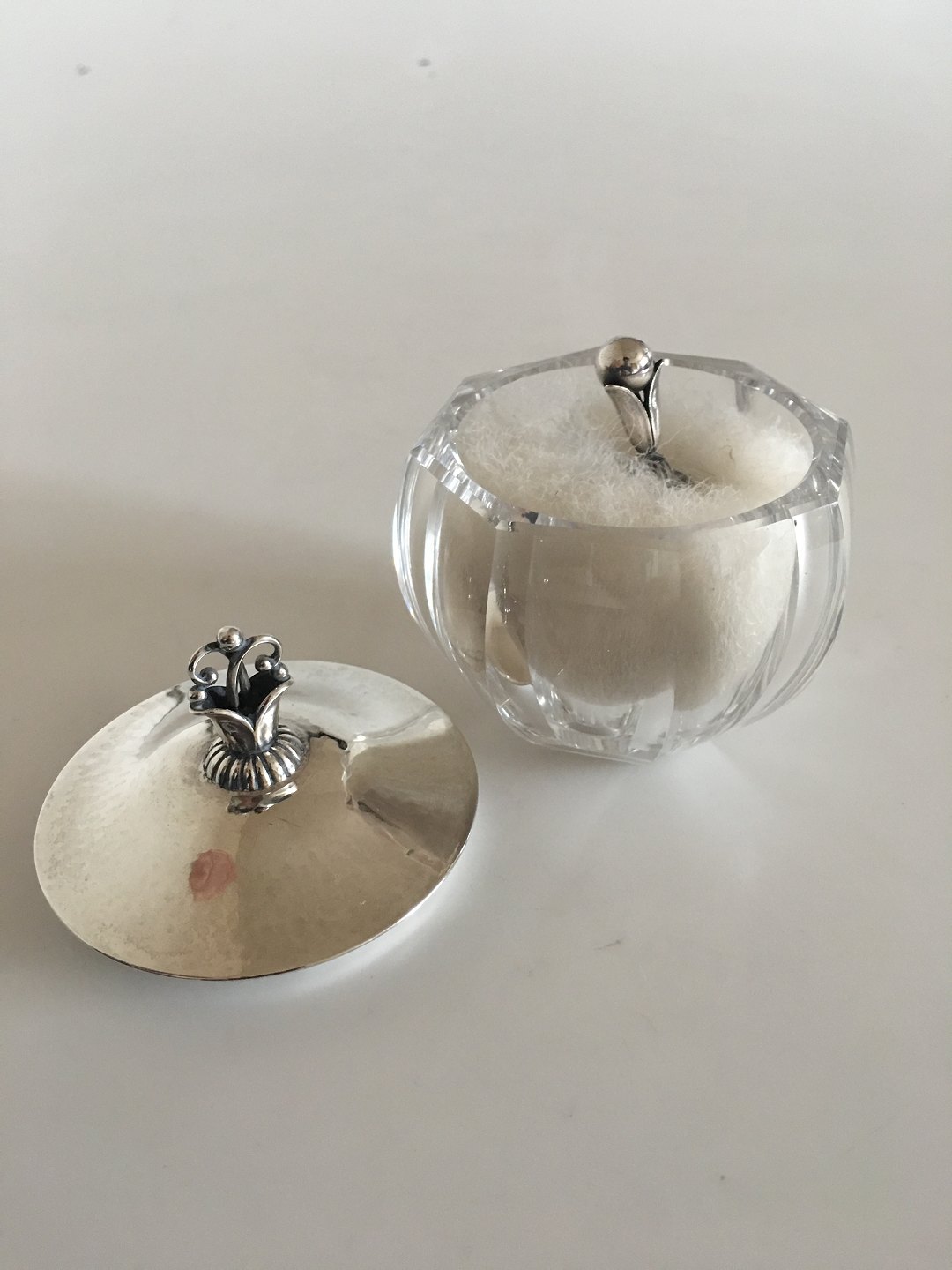 Georg Jensen Pudder Dunkvast til Kropsmakeup No 172 i Krystal Glas med Sterling Sølv Låg No 172. Med Georg Jensen Sølvstempler fra start 1920'erne. Glasset og Låget er i Perfekt Stand. Kvasten er alder taget i betragtning, også i fin stand. Glasset måler 5.5 cm H og 7 cm Ø. Sølvdelene Vejer 54 gram.