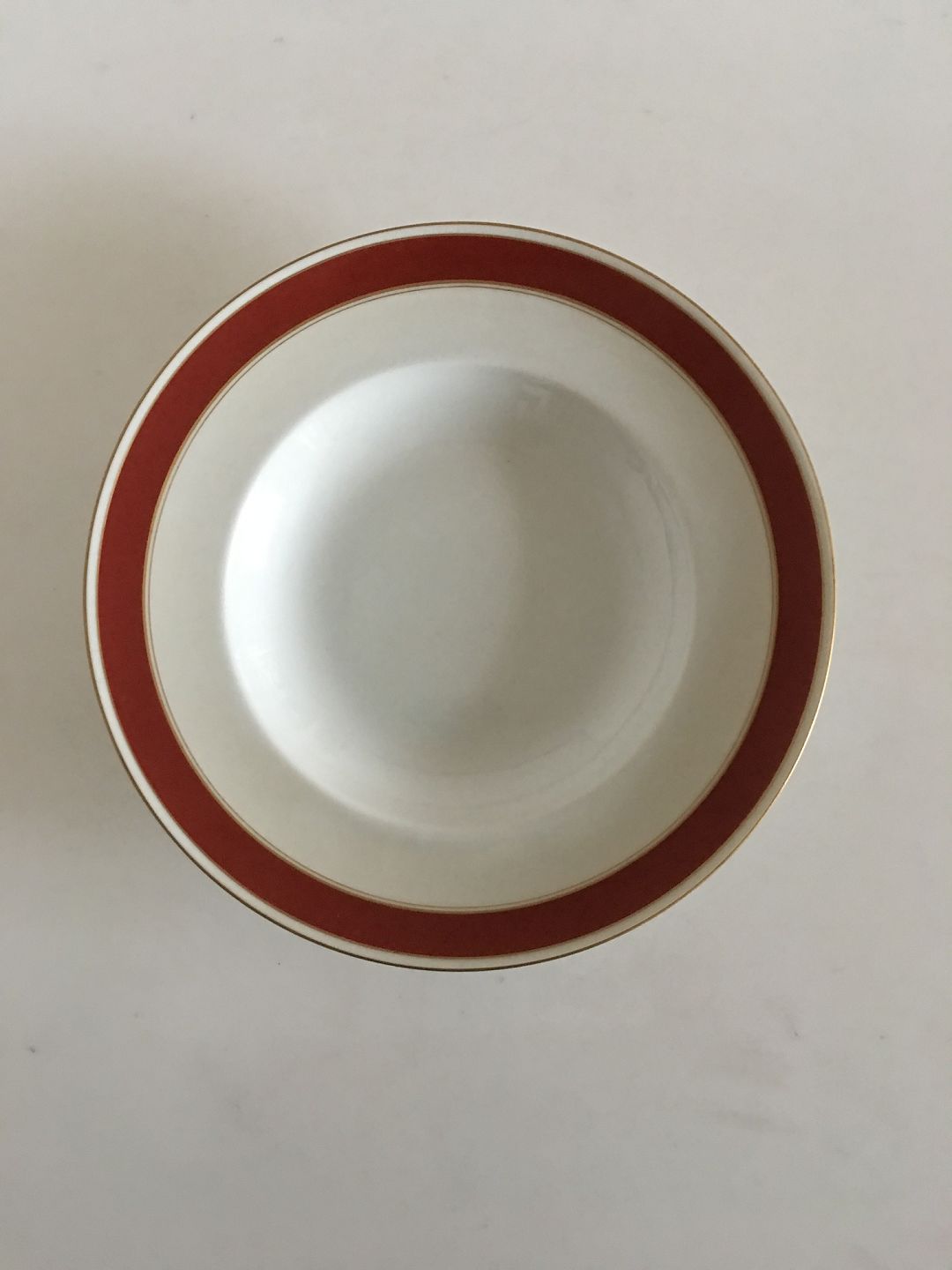 Bing & Grøndahl Egmont Dyb Tallerken No 22. Hvid med Vinrød Kant og Guldlinje. 24.5 cm Ø. I fin hel stand