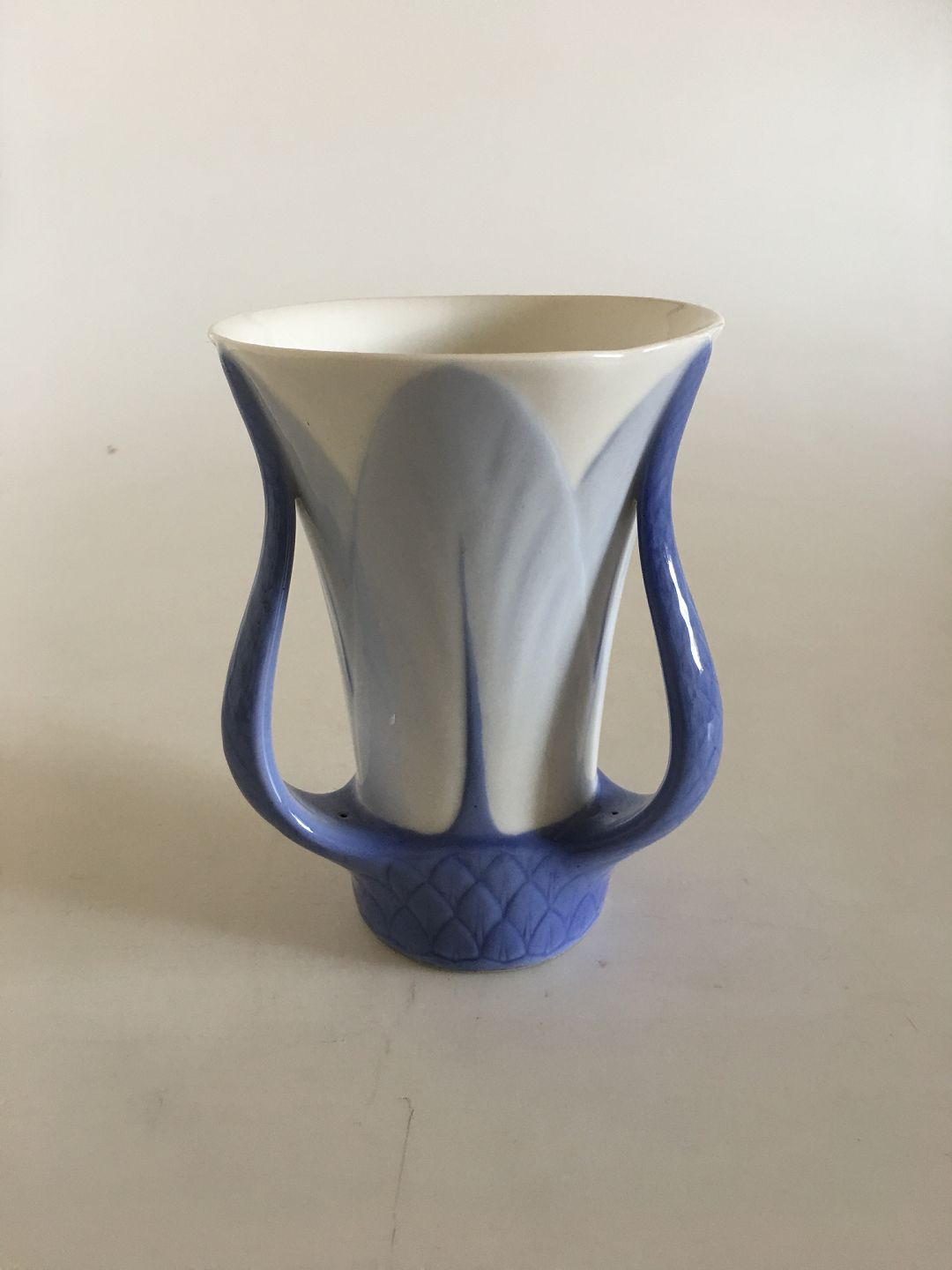 Royal Copenhagen Art Nouveau Vase med Tre Hanke. 1 Sortering, har dog en lille skævhed på kanten (se billede). I fin hel stand. 14.5 cm H (5 45/64"). 10.5 cm Ø (4 9/64")