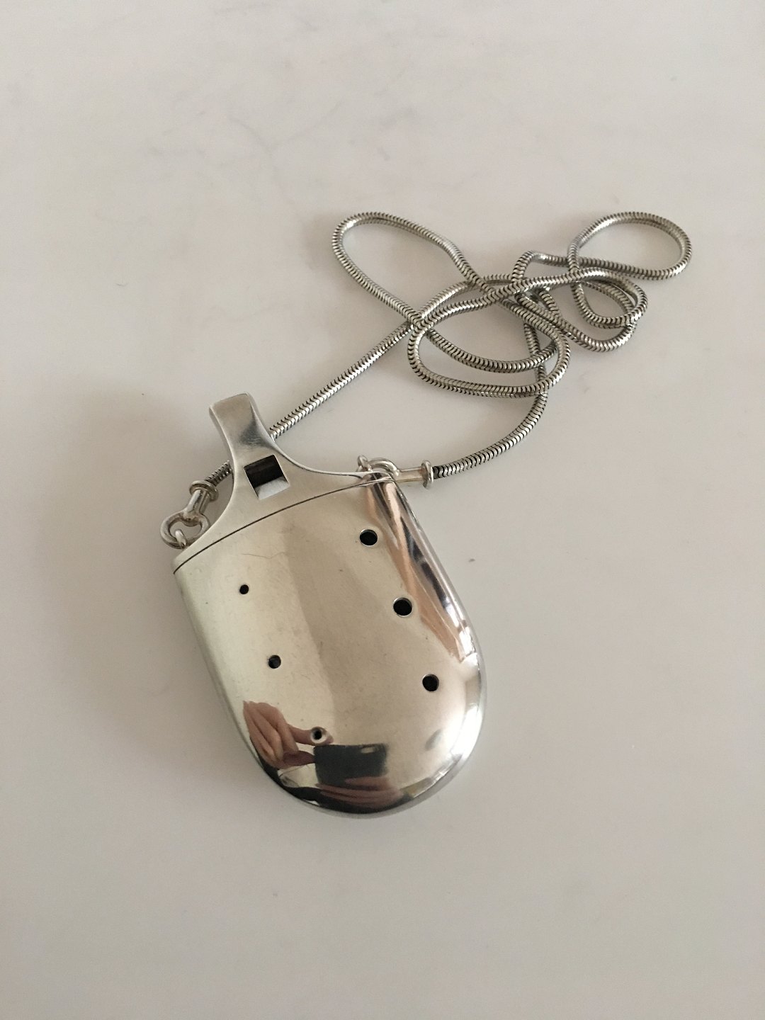 Hans Hansen Sterling Silver Whistle Flute with Chain. Works and in great condition. Measures 8 cm x 4 cm / 3 5/32 in. x 1 37/64 in. Weighs 86 g / 3 oz.
