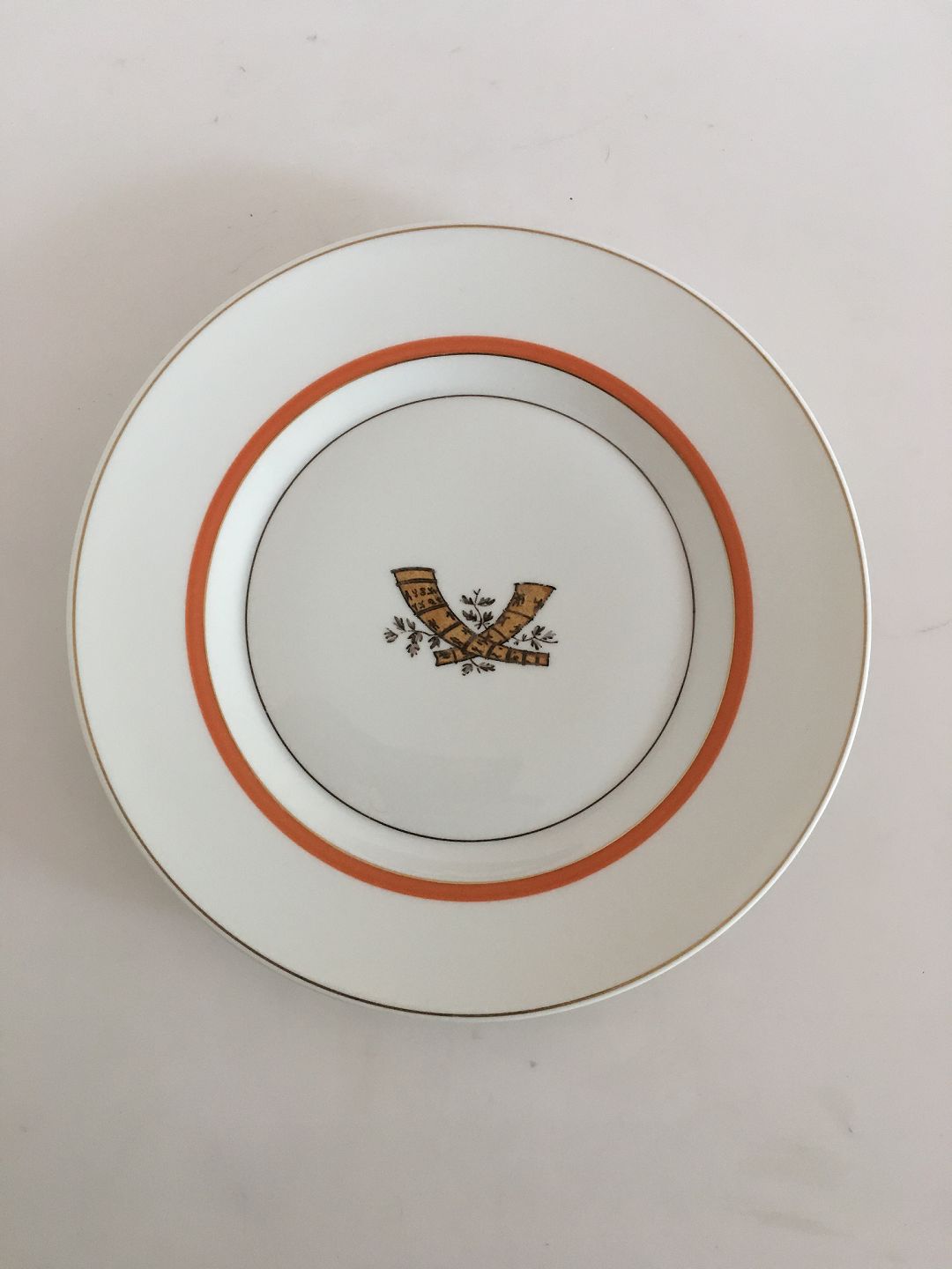 Royal Copenhagen Guldhornene med Orange Kant Middagstallerken No 883/9586. 25 cm dia.