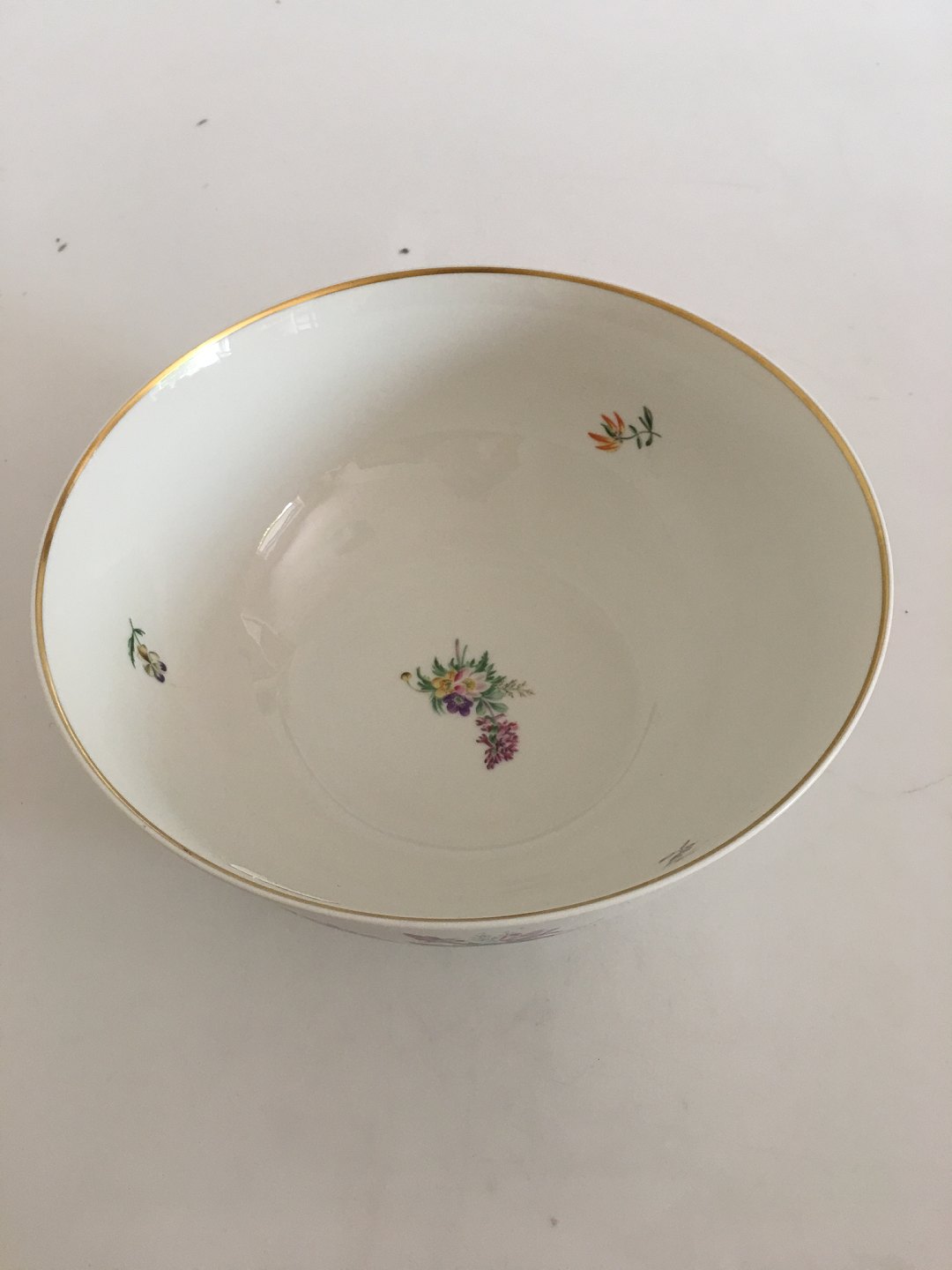 Royal Copenhagen Primavera Thorkild Olsen Bowl, Large No 1515/14027. White service with flower decoration and Gold Band. The bowl measures 10.5 cm H. 26 cm dia.
