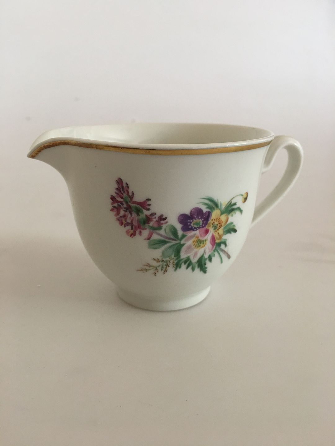 Royal Copenhagen Primavera Thorkild Olsen Creamer No 1515/9942. White Service with flower decoration and gold band. The creamer measures 7 cm H. 9 cm dia.