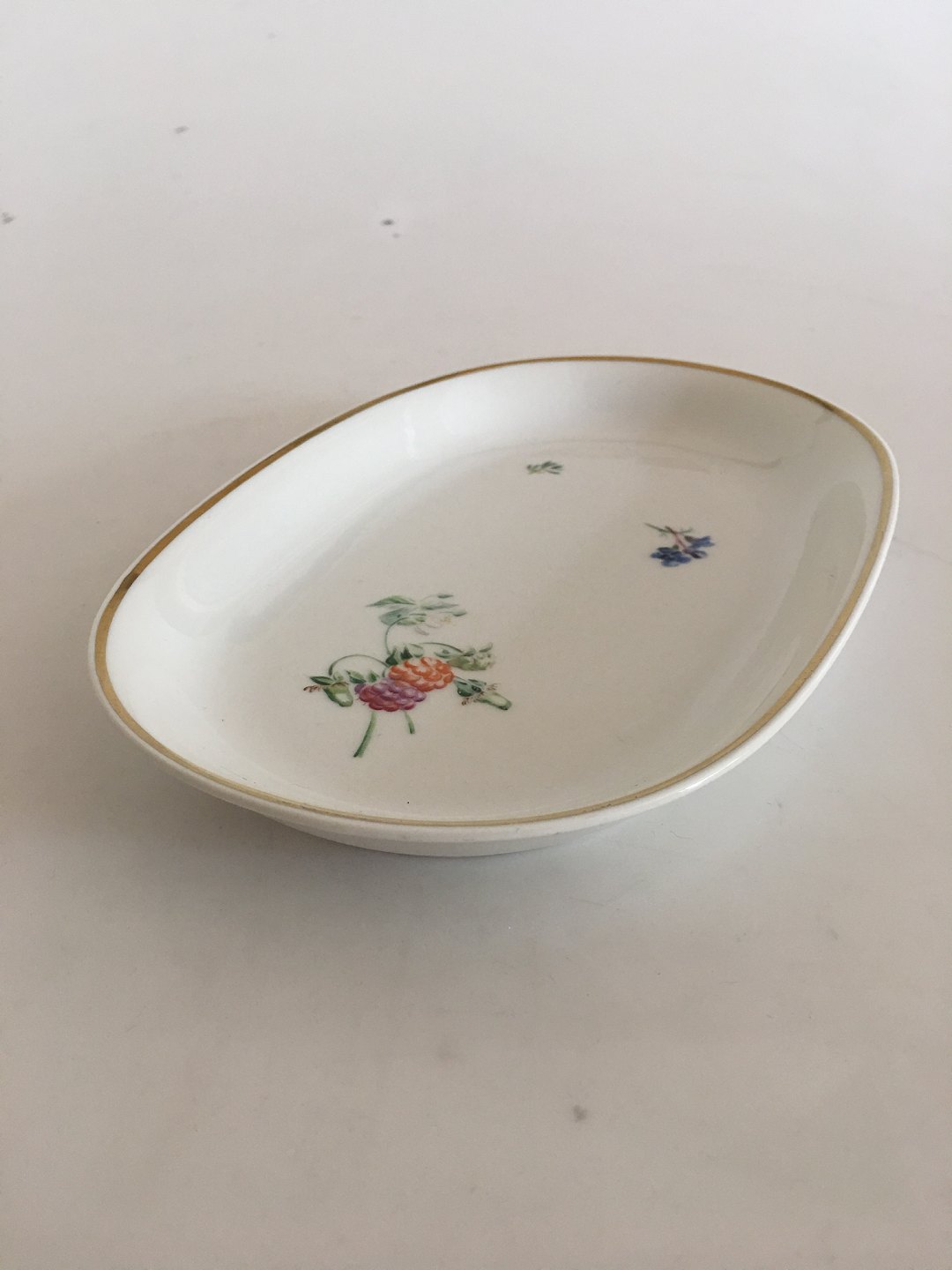 Royal Copenhagen Primavera Thorkild Olsen Oval Dish No 1515/14004. White service with flower decoration and gold band. The dish measures 21.5 x 14 cm.