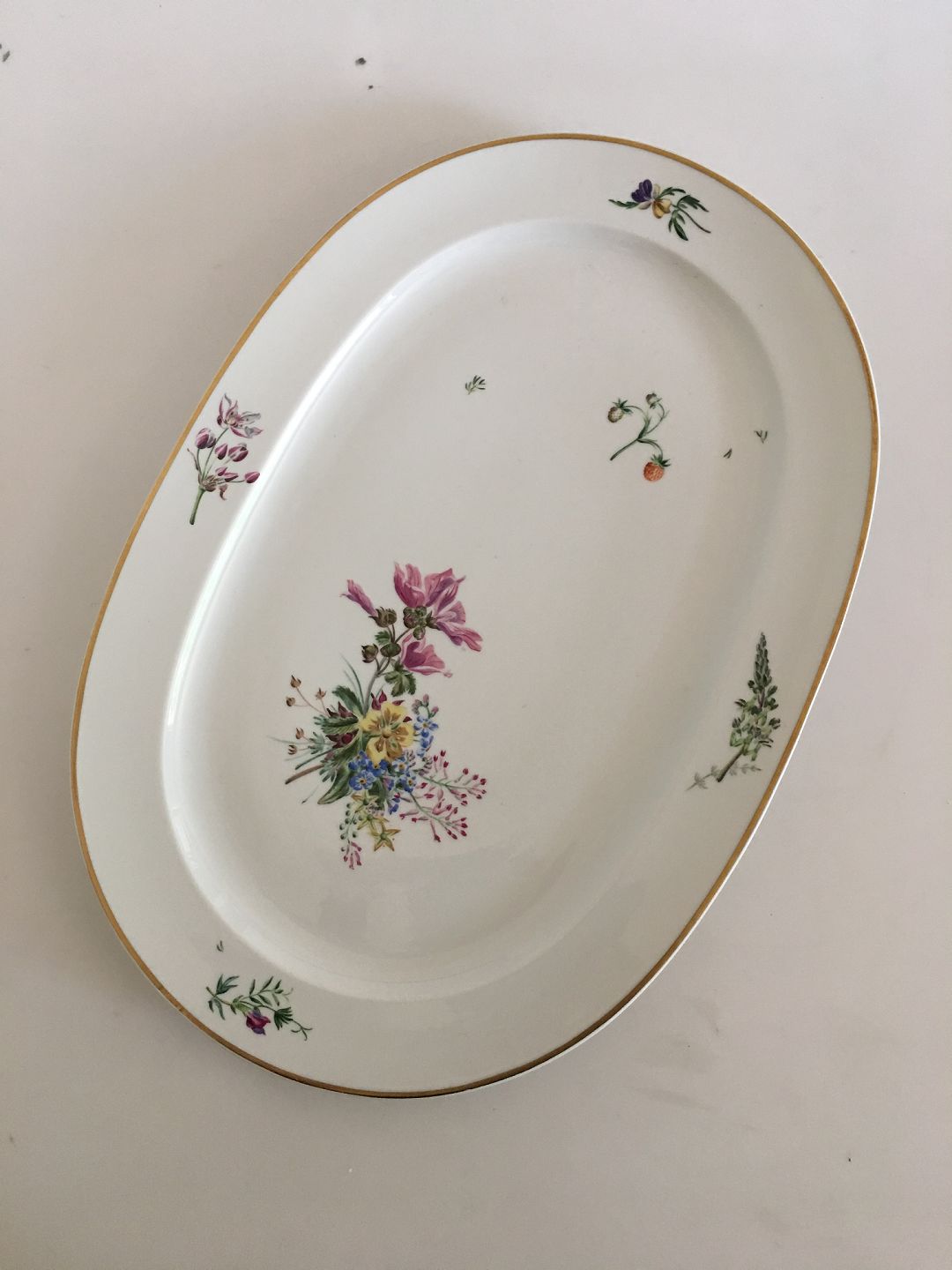 Royal Copenhagen Primavera Thorkild Olsen Oval Serving Platter No 1515/14029. White service with flower decoration and gold band. The platter measures 44.5 x 31 cm