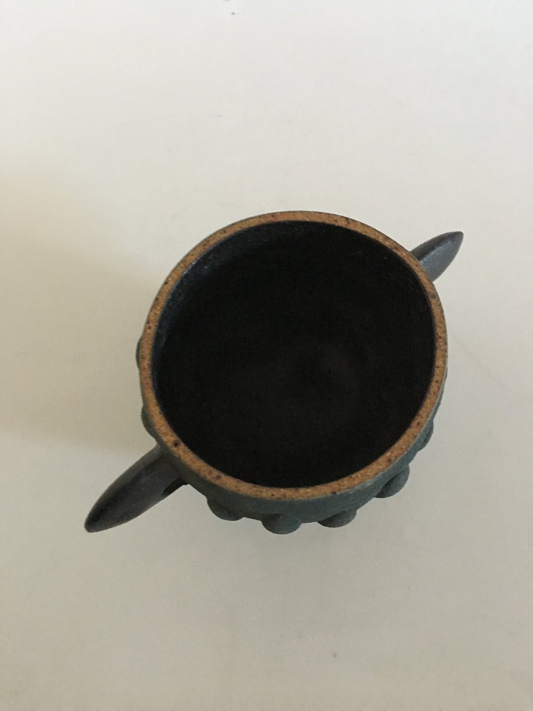 Royal Copenhagen Unique Modern Stoneware Vase by Pia Langelund. Two handles vase with a nice rough moss looking texture. The vase is 12.5 cm H (4 59/64"). 13 cm dia (5 1/8")