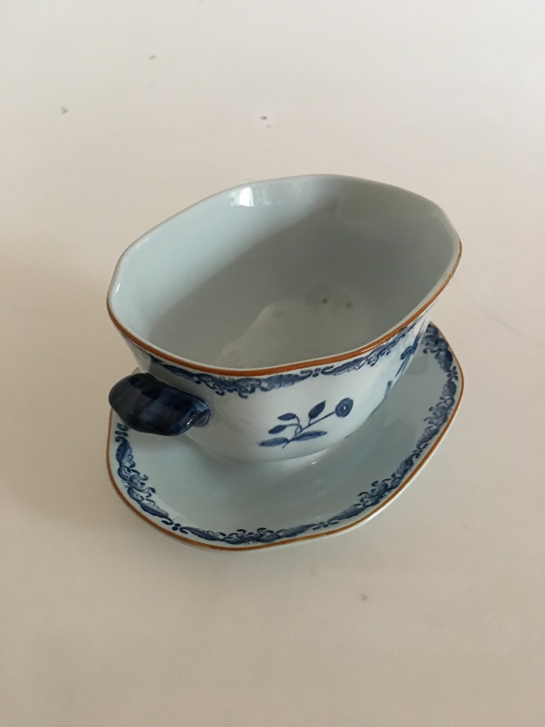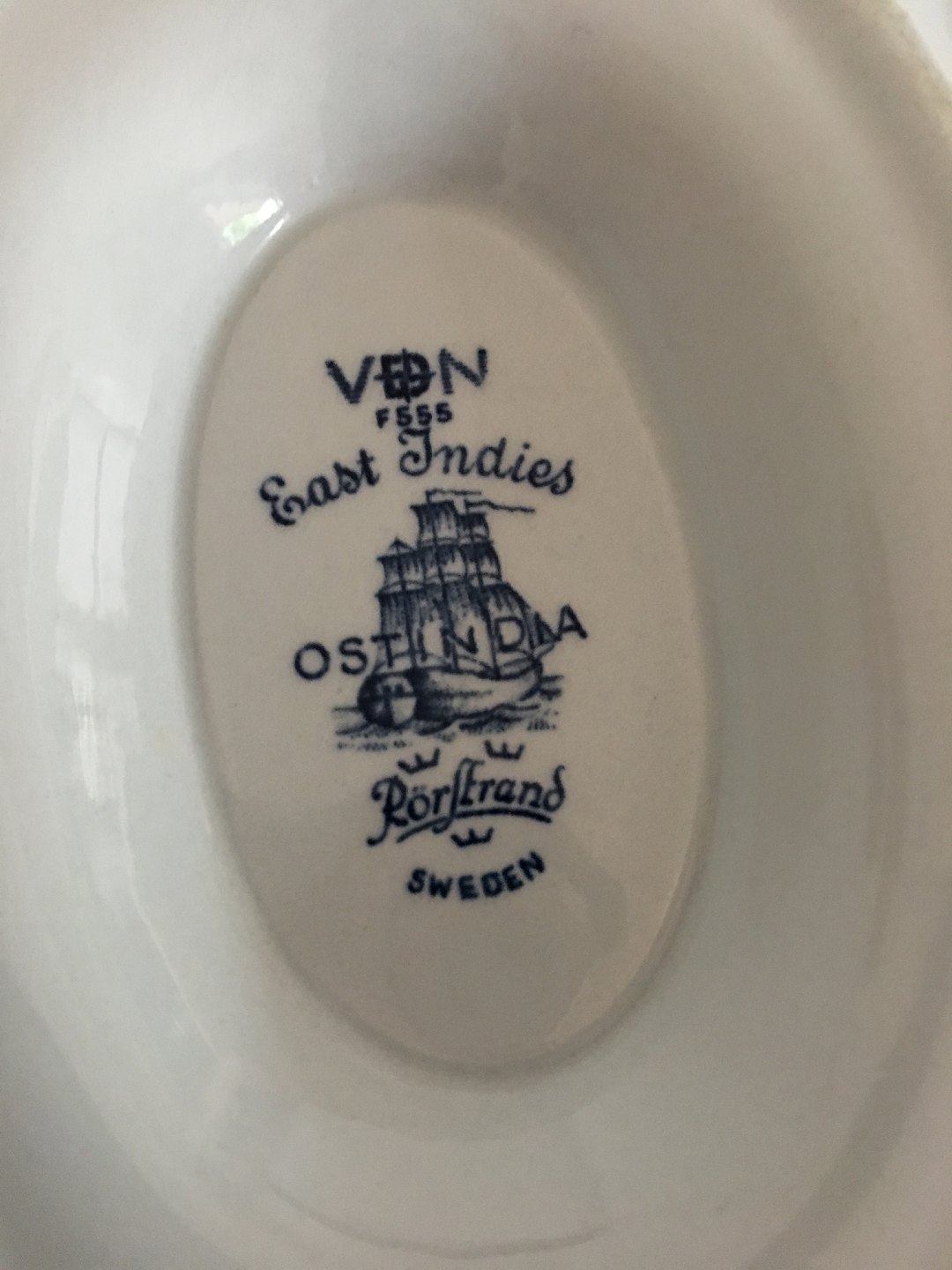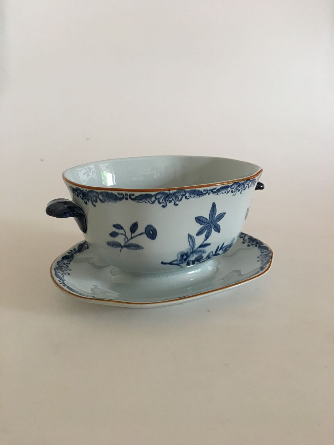 Rorstrand East Indies / Ostindia Sauceboat. Measures 9 cm / 3 35/64 in. x 18 cm / 7 3/32 in.