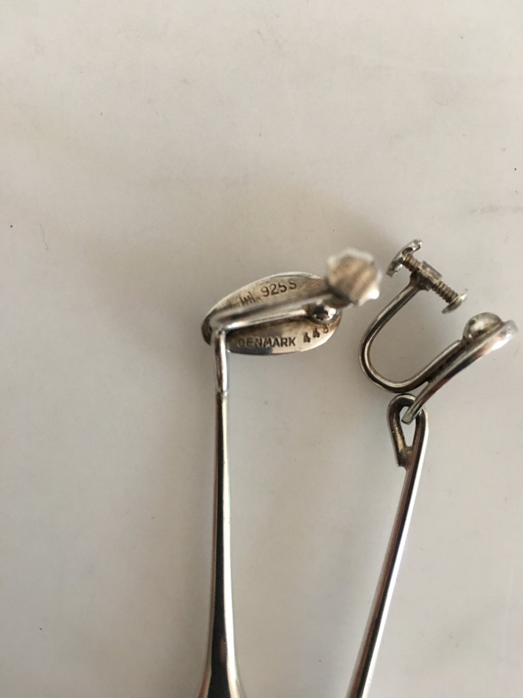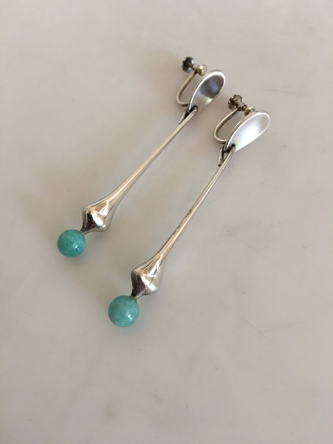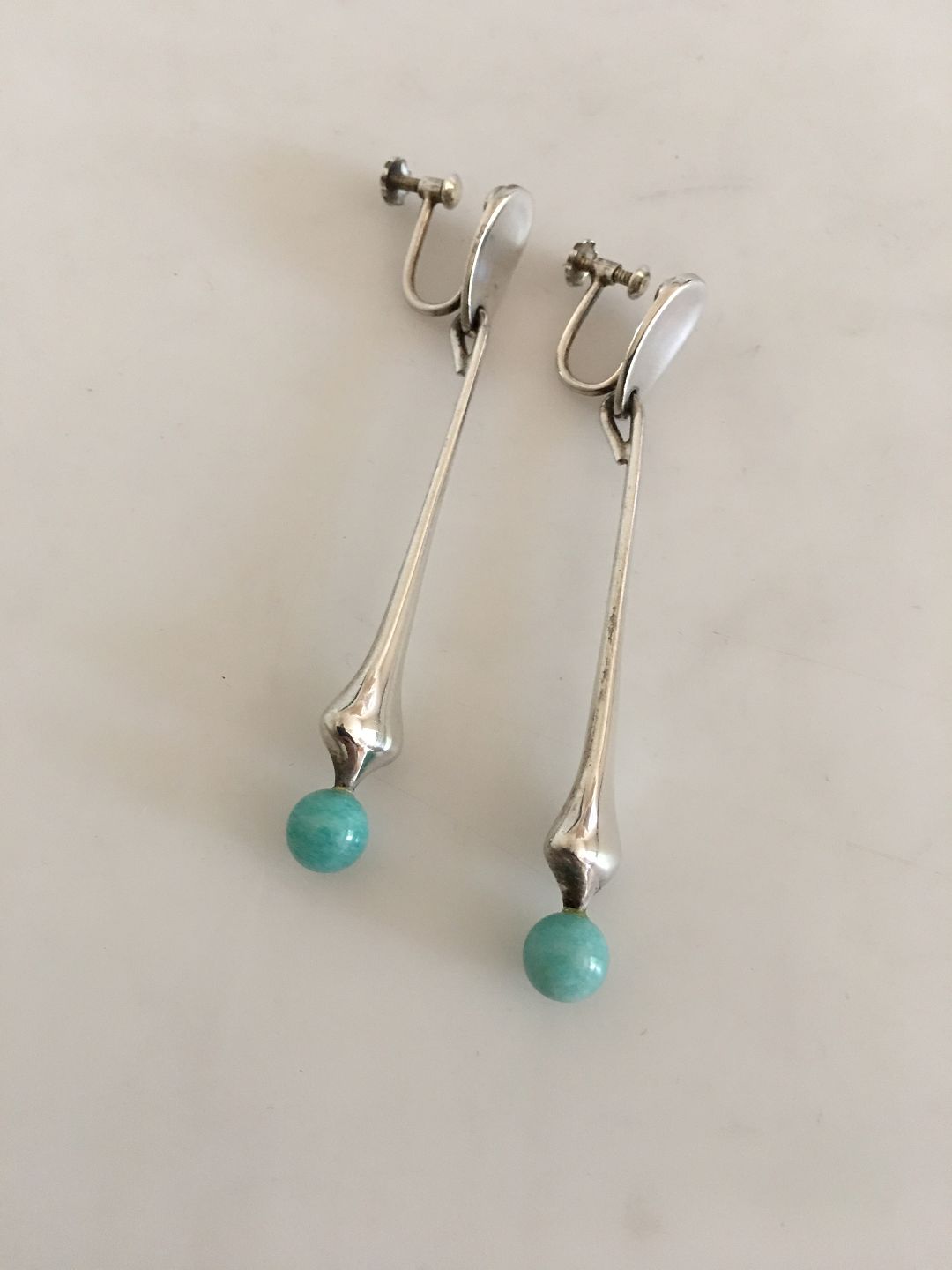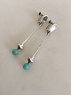 Hans Hansen Sterling Silver Earrings/Screws No 443 with Green Stones. Measures 7 cm / 2 3/4 in. Combined weight of 12 g / 0.40 oz.